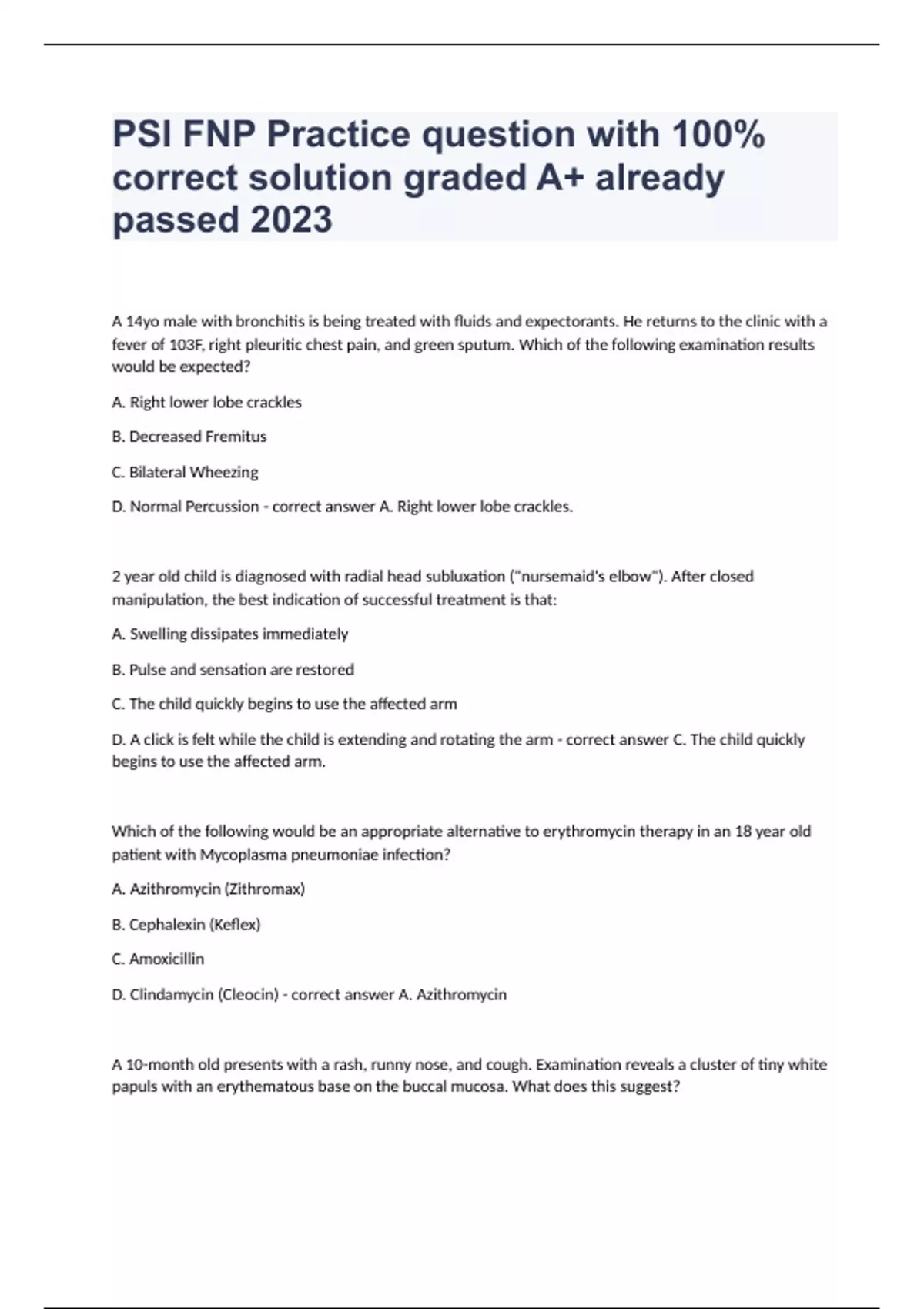 PSI FNP Practice question with 100% correct solution graded A+ already passed 2023A 14yo male with bronchitis is being treated with fluids and expectorants. He returns to the clinic with a fever of 103F, right pleuritic chest pain, and green sputum. Which of the following examination results would be expected? A. Right lower lobe crackles B. Decreased Fremitus C. Bilateral Wheezing D. Normal Percussion - correct answer A. Right lower lobe crackles. 2 year old child is diagnosed with radial head subluxation ("nursemaid's elbow"). After closed manipulation, the best indication of successful treatment is that: A. Swelling dissipates immediately B. Pulse and sensation are restored C. The child quickly begins to use the affected arm D. A click is felt while the child is extending and rotating the arm - correct answer C. The child quickly begins to use the affected arm. Which of the following would be an appropriate alternative to erythromycin therapy in an 18 year old patient with Mycoplasma pneumoniae infection? A. Azithromycin (Zithromax) B. Cephalexin (Keflex) C. Amoxicillin D. Clindamycin (Cleocin) - correct answer A. Azithromycin A 10-month old presents with a rash, runny nose, and cough. Examination reveals a cluster of tiny white papuls with an erythematous base on the buccal mucosa. What does this suggest? A. Scarlet fever B. Rubella C. Erythema infectiosum D. Measles - correct answer D. Measles Office Spriometry performed with an albuterol nebulizer treatment can confirm a diagnosis of asthma because it indicates: A. Oxygen saturation B. Whether airway obstruction is from pulmonary fibrosis C. Chronic carbon dioxide retention D. Whether a patient has reversible airway obstruction - correct answer D. Whether a patient has reversible airway obstruction An 18yr old patient presents with complaints of maxillary facial pain and yellow nasal discharge for 14 days. What is the appropriate initial pharmacologic intervention? A. Amoxicillin-Clavulanate (Augmentin) B. Ceftriaxone (Rocephin) C. Levofloxacin (Levaquin) D. Erythromycin - correct answer A. Amoxicillin-Clavulanate (Augmentin) Which of the following is the leading cause of cancer-related deaths in the majority of women? A. cervical Cancer B. Ovarian Cancer C. Breat Cancer D. Lung Cancer - correct answer D. Lung Cancer A 29-year old male with noncomplicated Chlamidia infection may exhibit: A. Urticaria B. No remarkable clinical symptoms C. A green mucoid penile discharge D. A penile ulcer - correct answer B. No remarkable clinical symptoms To assess a patient's ability to think abstractly, a nurse practitioner could ask the patient: A. The meaning of a common proverb B. What action the patient would take if their was a fire in the house C. To count backwards from 100 by 7s D. To spell a word backward. - correct answer A. The meaning of a common proverb A common rule to follow when prescribing many medications for the elderly is to: A. Give most medications in the morning to allow slowed body functions to have time to adjust to the drug. B. Start at a lower dose than what is commonly prescribed for adults, and increase the dose slowly. C. Perform a creatinine clearance test for baseline data on all person over age 70 before starting on new medications. D. Give medication with a full glass of water to promote absorption and limit harm to the kidneys. - correct answer B. Start at a low dose than what is commonly prescribed for adults, and increase the dose slowly. A 72 year old female presents with a medical history unremarkable except for the occasional headache. She enjoyed emotional health throughout marriage and childrearing, although her family history is significant for strokes and nervous breakdowns. Since her husband died a year ago, however, she has been waking every morning at 3am, is reluctant to go out although she has family member living nearby, and feels a continual urge to sleep. She cannot discuss her late husband without crying. Differential diagnoses would include: A. Stroke, depression, and hyperthyroidism B. Depression, Unresolved grief, and hypothyroidism C. Migraine, anxiety disorder, and hypertension D. Dementia, delirium, and pna - correct answer B. Depression, Unresolved grief, and hypothyroidism The parent of a 13-year old diagnosed with seizure disorder calls to report that the child is exhibiting symptoms of a cold, but has no fever. The nurse practitioner should advise the parent that development of fever may: A. make the seizure medication less effective
