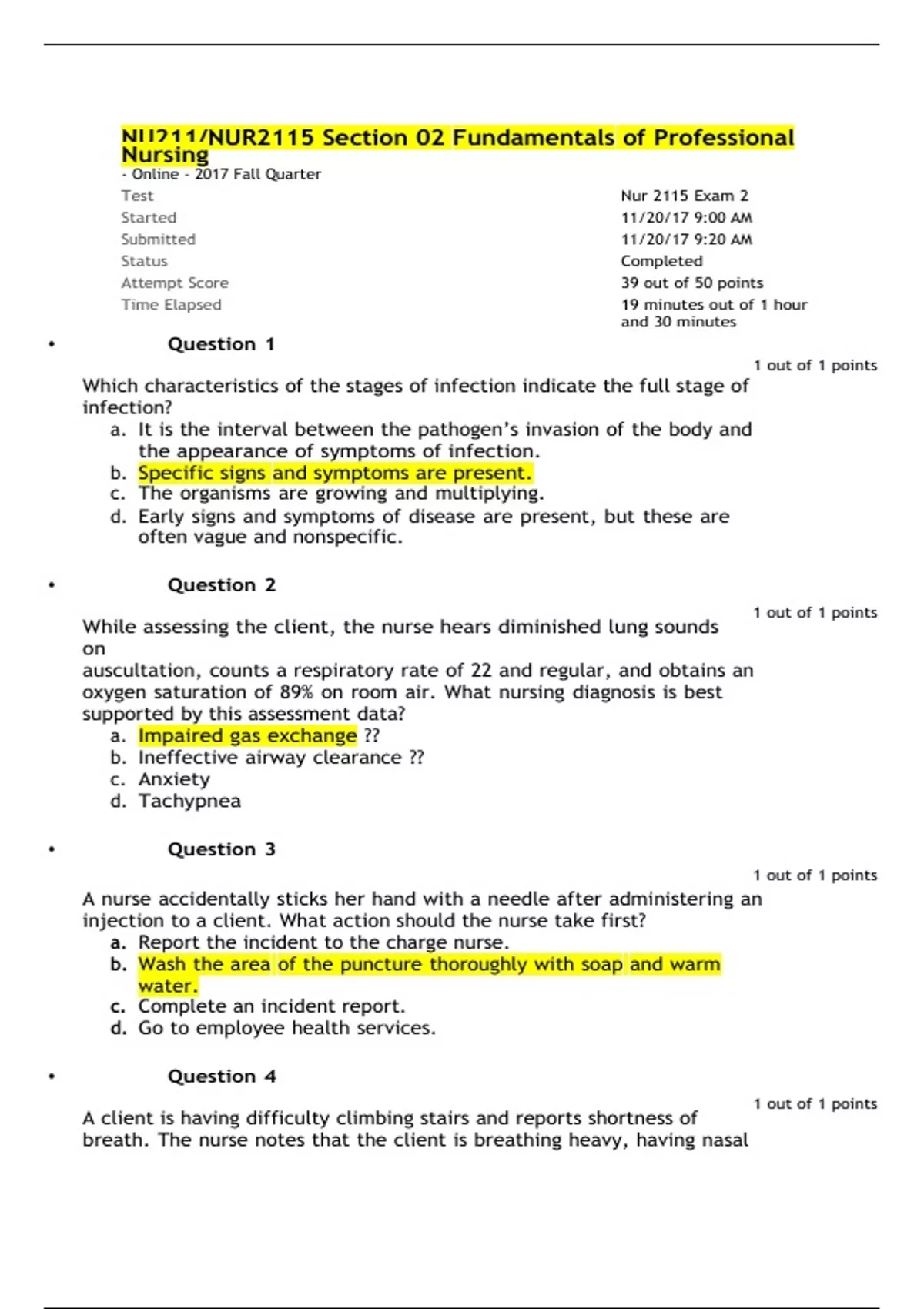 NU211/NUR2115 Section 02 Fundamentals of Professional Nursing - Online - 2017 Fall Quarter Test Nur 2115 Exam 2 Started 11/20/17 9:00 AM Submitted 11/20/17 9:20 AM Status Completed Attempt Score 39 out of 50 points Time Elapsed 19 minutes out of 1 hour and 30 minutes • Question 1 Which characteristics of the stages of infection indicate the full stage of infection? 1 out of 1 points a. It is the interval between the pathogen’s invasion of the body and the appearance of symptoms of infection. b. Specific signs and symptoms are present. c. The organisms are growing and multiplying. d. Early signs and symptoms of disease are present, but these are often vague and nonspecific. • Question 2 While assessing the client, the nurse hears diminished lung sounds on 1 out of 1 points auscultation, counts a respiratory rate of 22 and regular, and obtains an oxygen saturation of 89% on room air. What nursing diagnosis is best supported by this assessment data? a. Impaired gas exchange ?? b. Ineffective airway clearance ?? c. Anxiety d. Tachypnea