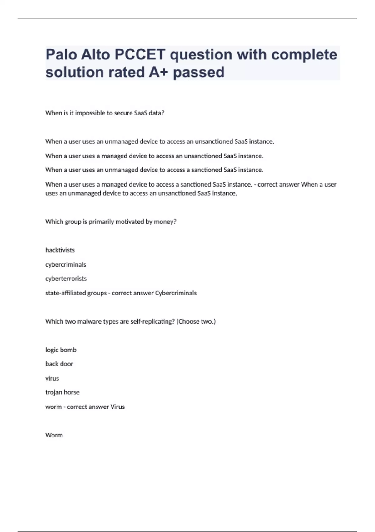 Palo Alto PCCET question with complete solution rated A+ passedWhen is it impossible to secure SaaS data? When a user uses an unmanaged device to access an unsanctioned SaaS instance. When a user uses a managed device to access an unsanctioned SaaS instance. When a user uses an unmanaged device to access a sanctioned SaaS instance. When a user uses a managed device to access a sanctioned SaaS instance. - correct answer When a user uses an unmanaged device to access an unsanctioned SaaS instance. Which group is primarily motivated by money? hacktivists cybercriminals cyberterrorists state-affiliated groups - correct answer Cybercriminals Which two malware types are self-replicating? (Choose two.) logic bomb back door virus trojan horse worm - correct answer Virus Worm Which type of attack includes an email advertisement for a dry cleaning service? spamming phishing spear phishing whaling - correct answer Spamming Who is the most likely target of social engineering? Executive management, because it has the most permissions. Senior IT engineers, because the attacker hopes to get them to disable the security infrastructure. Junior people, because they are easier to stress and probably not as well trained. The accounting department, because it can wire money directly to the attacker's account. - correct answer Junior people, because they are easier to stress and probably not as well trained. Which two attacks typically use a botnet? (Choose two.) Ssocial engineering DoS DDoS Sending spam to a lengthy mailing list Spear phishing - correct answer DDoS Sending spam to a lengthy mailing list. What is the name of the attack in which the attacker gets the victim to connect to an access point the attack controls? Person in the middle Man in the middle