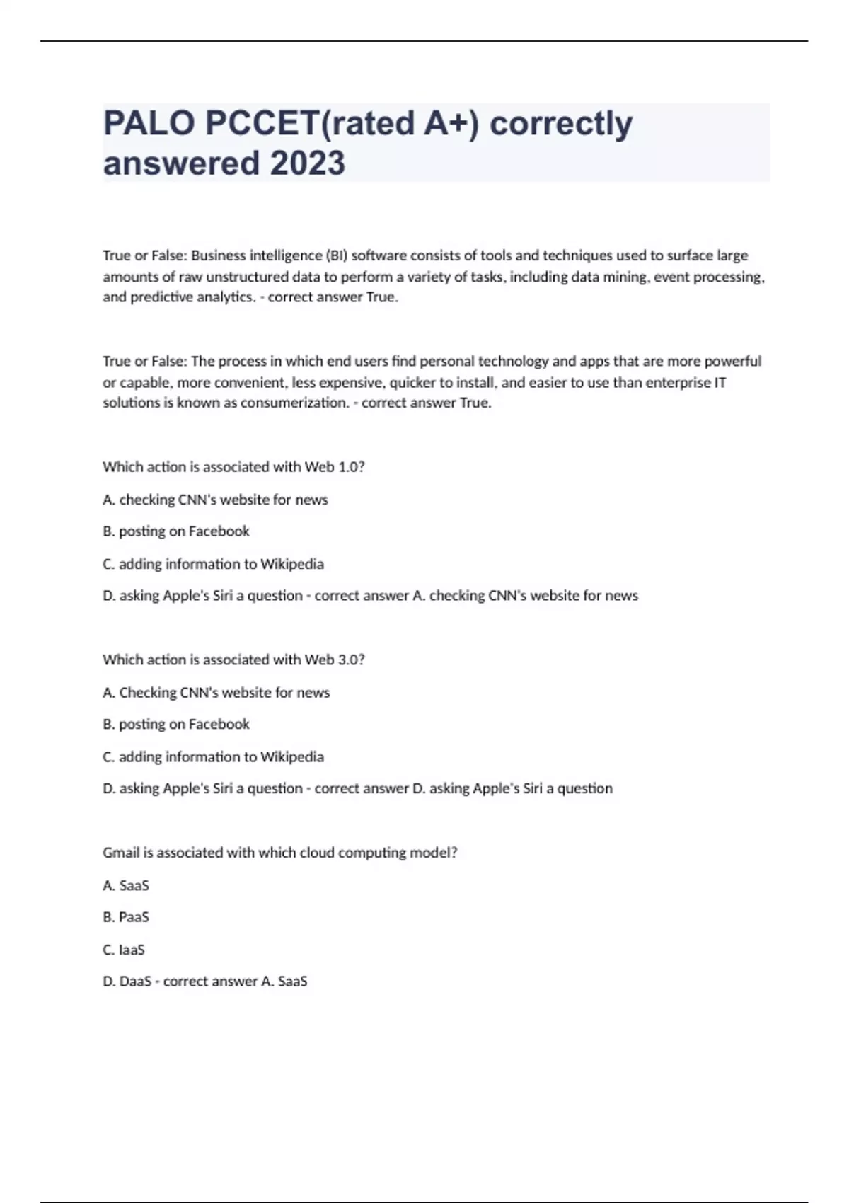 PALO PCCET(rated A+) correctly answered 2023True or False: Business intelligence (BI) software consists of tools and techniques used to surface large amounts of raw unstructured data to perform a variety of tasks, including data mining, event processing, and predictive analytics. - correct answer True. True or False: The process in which end users find personal technology and apps that are more powerful or capable, more convenient, less expensive, quicker to install, and easier to use than enterprise IT solutions is known as consumerization. - correct answer True. Which action is associated with Web 1.0? A. checking CNN's website for news B. posting on Facebook C. adding information to Wikipedia D. asking Apple's Siri a question - correct answer A. checking CNN's website for news Which action is associated with Web 3.0? A. Checking CNN's website for news B. posting on Facebook C. adding information to Wikipedia D. asking Apple's Siri a question - correct answer D. asking Apple's Siri a question Gmail is associated with which cloud computing model? A. SaaS B. PaaS C. IaaS D. DaaS - correct answer A. SaaS Which two port numbers are associated with HTTP? (Choose two.) A. 80 B. 389 C. 8080 D. 25 - correct answer A. 80 C. 8080 Which port number is associated with HTTPS? A. 21 B. 23 C. 443 D. 53 - correct answer C. 443 Which port is used for encrypted communication? A. 22 B. 80 C. 389 D. 25 - correct answer A. 22 Which protocol distinguishes between applications using port numbers? A. TCP B. ICMP C. ESP D. UDP - correct answer How do attackers prevent port scans from being noticed by monitoring software? A. scan ports so quickly it is finished before it can be detected and stopped B. scan ports so slowly it looks like random attempts to connect, rather than a concerted attack C. scan ports from an internal device
