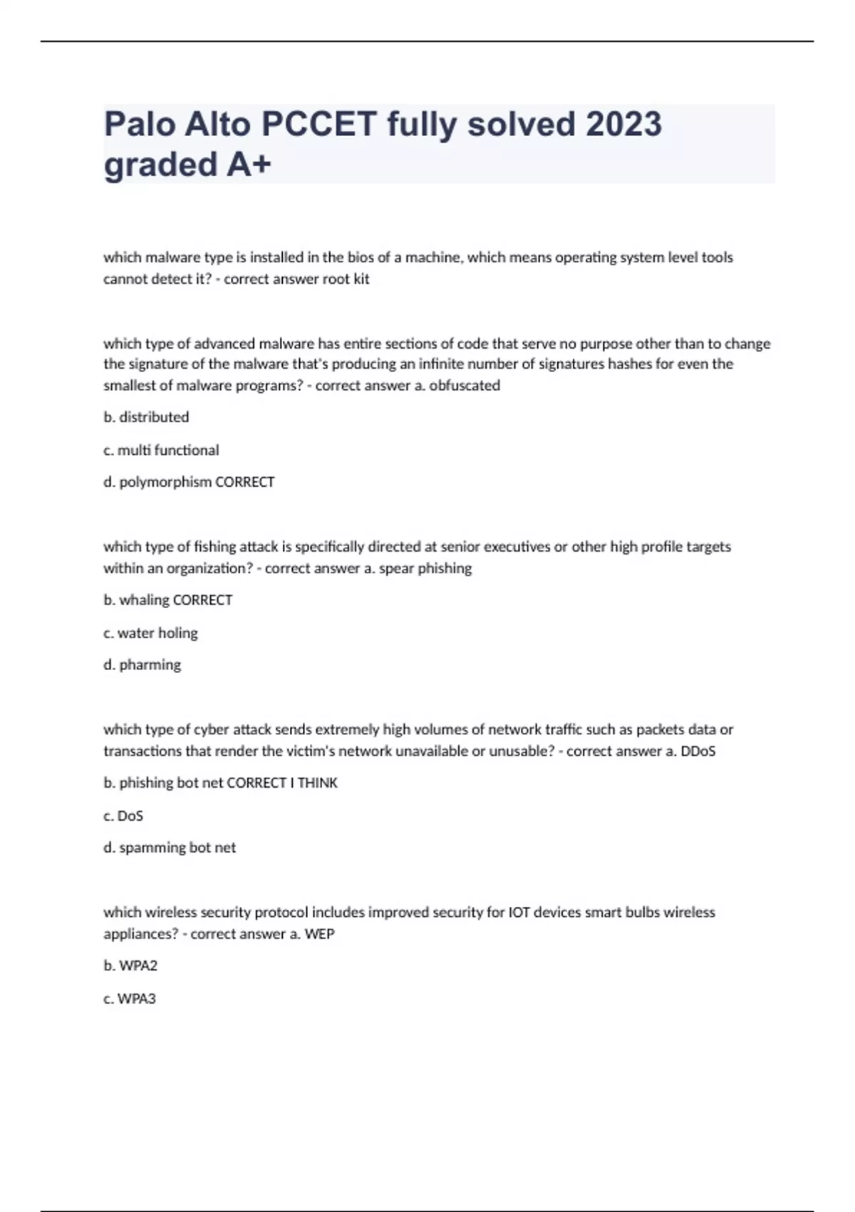 Palo Alto PCCET fully solved 2023 graded A+ which malware type is installed in the bios of a machine, which means operating system level tools cannot detect it? - correct answer root kit which type of advanced malware has entire sections of code that serve no purpose other than to change the signature of the malware that's producing an infinite number of signatures hashes for even the smallest of malware programs? - correct answer a. obfuscated b. distributed c. multi functional d. polymorphism CORRECT which type of fishing attack is specifically directed at senior executives or other high profile targets within an organization? - correct answer a. spear phishing b. whaling CORRECT c. water holing d. pharming which type of cyber attack sends extremely high volumes of network traffic such as packets data or transactions that render the victim's network unavailable or unusable? - correct answer a. DDoS b. phishing bot net CORRECT I THINK c. DoS d. spamming bot net which wireless security protocol includes improved security for IOT devices smart bulbs wireless appliances? - correct answer a. WEP b. WPA2 c. WPA3 d. WPA1 with zero test capability provides a combination of anti-malware and intrusion and prevention technologies to protect against both known and unknown threats including mobile device threats? - correct answer a. inspection of all traffic b. least privilege c. secure access d. cyber threat protection CORRECT which core components of cortex combines security orchestration insert management and interactive investigation to serve security teams across the incident life cycle? - correct answer a. Cortex XDR b. Cortex XSOAR CORRECT c. Cortex Data Lake d. Auto Focus choose the network device that transmits an electronic signal so that the wireless device is can connect to a network - correct answer a. router b. access point CORRECT c. hub d. switch routing protocols are defined at which layer of the OSI model and specify how routers communicate with one another on a network - correct answer a. network CORRECT b. application c. data link d. transport which record specifies authoritative information about a DNS zone such as primary name server email address of the domain administrator and domain serial number? - correct answer a. Canonical Name (CNAME) b. Mail Exchanger (MX)