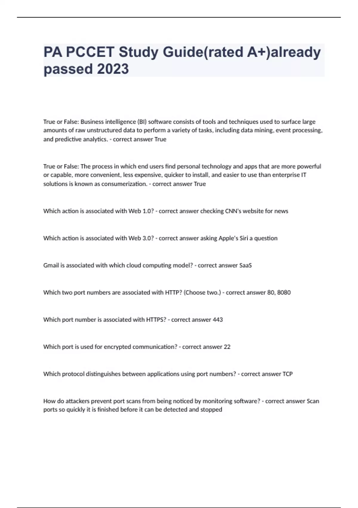 PA PCCET Study Guide(rated A+)already passed 2023True or False: Business intelligence (BI) software consists of tools and techniques used to surface large amounts of raw unstructured data to perform a variety of tasks, including data mining, event processing, and predictive analytics. - correct answer True True or False: The process in which end users find personal technology and apps that are more powerful or capable, more convenient, less expensive, quicker to install, and easier to use than enterprise IT solutions is known as consumerization. - correct answer True Which action is associated with Web 1.0? - correct answer checking CNN's website for news Which action is associated with Web 3.0? - correct answer asking Apple's Siri a question Gmail is associated with which cloud computing model? - correct answer SaaS Which two port numbers are associated with HTTP? (Choose two.) - correct answer 80, 8080 Which port number is associated with HTTPS? - correct answer 443 Which port is used for encrypted communication? - correct answer 22 Which protocol distinguishes between applications using port numbers? - correct answer TCP How do attackers prevent port scans from being noticed by monitoring software? - correct answer Scan ports so quickly it is finished before it can be detected and stopped Which potentially risky attribute is the most serious? - correct answer Malware Which one of these applications can be used as a tunnel for other applications? - correct answer SSH Which two devices or systems require the configuration of non-standard ports to be able to use an application on a non-standard port? (Choose two.) - correct answer Client, Server If you are responsible for the application's security, but not the operating system's security, which cloud computing service model are you using? - correct answer PaaS Which kind of security always is the responsibility of the cloud customer? - correct answer Data Security Where is your data typically stored in a SaaS application? - correct answer in the cloud, in a database controlled by the SaaS provider Who is responsible for the security settings in an enterprise SaaS application? (choose the best answer) - correct answer Both IT administrators and users When is it impossible to secure SaaS data? - correct answer when a user uses an unmanaged device to access an unsanctioned SaaS