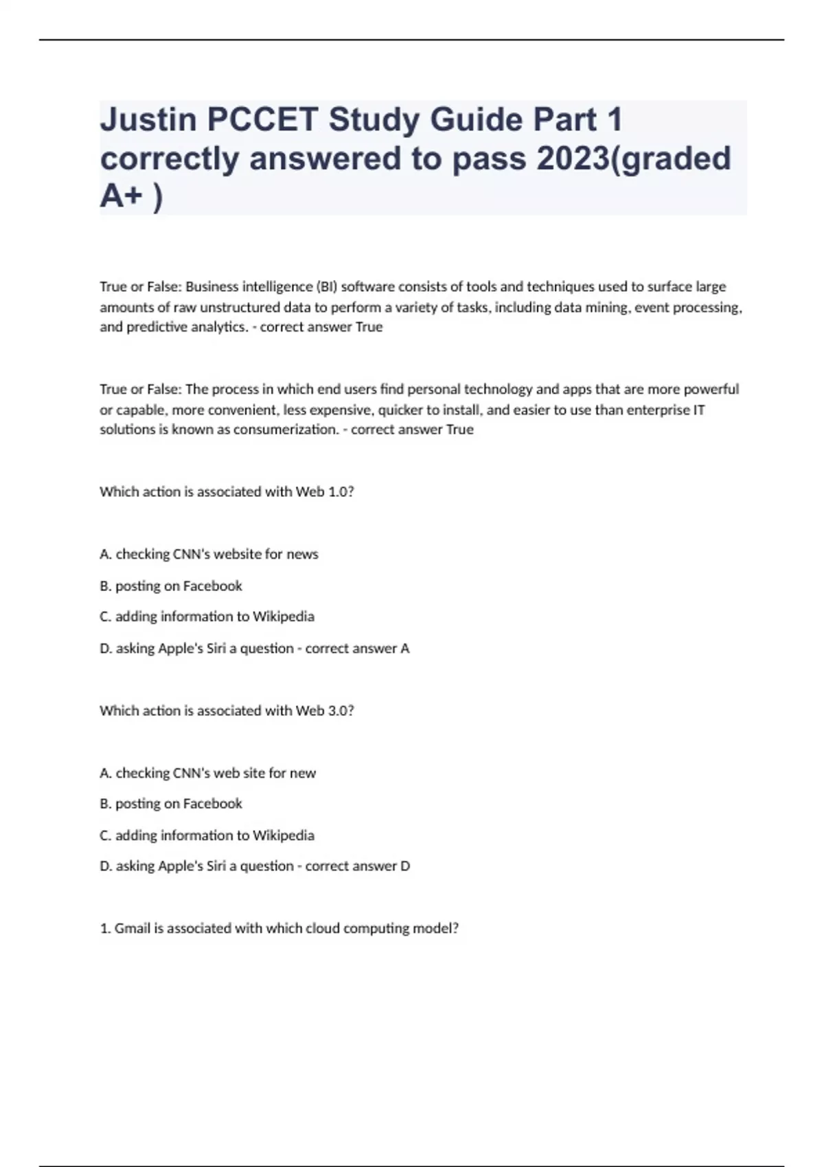 Justin PCCET Study Guide Part 1 correctly answered to pass 2023(graded A+ )True or False: Business intelligence (BI) software consists of tools and techniques used to surface large amounts of raw unstructured data to perform a variety of tasks, including data mining, event processing, and predictive analytics. - correct answer True True or False: The process in which end users find personal technology and apps that are more powerful or capable, more convenient, less expensive, quicker to install, and easier to use than enterprise IT solutions is known as consumerization. - correct answer True Which action is associated with Web 1.0? A. checking CNN's website for news B. posting on Facebook C. adding information to Wikipedia D. asking Apple's Siri a question - correct answer A Which action is associated with Web 3.0? A. checking CNN's web site for new B. posting on Facebook C. adding information to Wikipedia D. asking Apple's Siri a question - correct answer D 1. Gmail is associated with which cloud computing model? A. SaaS B. PaaS C. IaaS D. DaaS - correct answer A Which two port numbers are associated with HTTP? (Choose two.) A. 80 B. 389 C. 8080 D. 25 - correct answer A & C Which port number is associated with HTTPS? A. 21 B. 23 C. 443 D. 53 - correct answer C Which port is used for encrypted communication? A. 22 B. 80 C. 389 D. 25 - correct answer A Which protocol distinguishes between applications using port numbers? A. TCP B. ICMP C. ESP