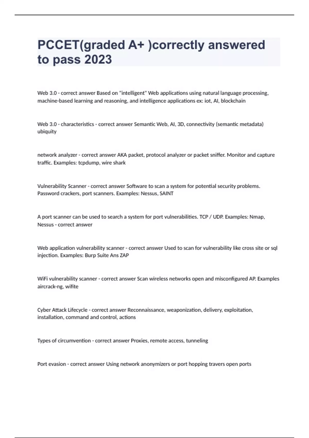 PCCET(graded A+ )correctly answered to pass 2023Web 3.0 - correct answer Based on "intelligent" Web applications using natural language processing, machine-based learning and reasoning, and intelligence applications ex: iot, AI, blockchain Web 3.0 - characteristics - correct answer Semantic Web, AI, 3D, connectivity (semantic metadata) ubiquity network analyzer - correct answer AKA packet, protocol analyzer or packet sniffer. Monitor and capture traffic. Examples: tcpdump, wire shark Vulnerability Scanner - correct answer Software to scan a system for potential security problems. Password crackers, port scanners. Examples: Nessus, SAINT A port scanner can be used to search a system for port vulnerabilities. TCP / UDP. Examples: Nmap, Nessus - correct answer Web application vulnerability scanner - correct answer Used to scan for vulnerability like cross site or sql injection. Examples: Burp Suite Ans ZAP WiFi vulnerability scanner - correct answer Scan wireless networks open and misconfigured AP. Examples aircrack-ng, wifite Cyber Attack Lifecycle - correct answer Reconnaissance, weaponization, delivery, exploitation, installation, command and control, actions Types of circumvention - correct answer Proxies, remote access, tunneling