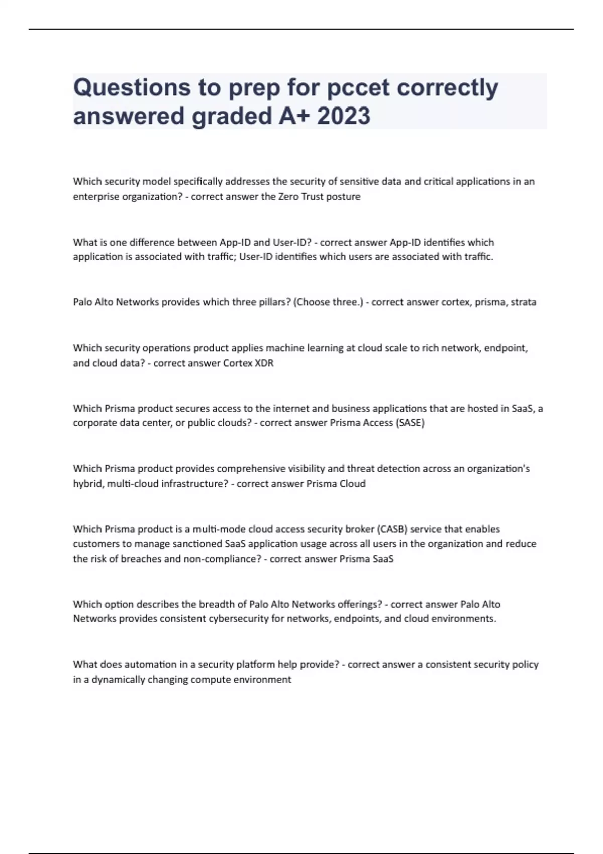 Questions to prep for pccet correctly answered graded A+ 2023Which security model specifically addresses the security of sensitive data and critical applications in an enterprise organization? - correct answer the Zero Trust posture What is one difference between App-ID and User-ID? - correct answer App-ID identifies which application is associated with traffic; User-ID identifies which users are associated with traffic. Palo Alto Networks provides which three pillars? (Choose three.) - correct answer cortex, prisma, strata Which security operations product applies machine learning at cloud scale to rich network, endpoint, and cloud data? - correct answer Cortex XDR Which Prisma product secures access to the internet and business applications that are hosted in SaaS, a corporate data center, or public clouds? - correct answer Prisma Access (SASE) Which Prisma product provides comprehensive visibility and threat detection across an organization's hybrid, multi-cloud infrastructure? - correct answer Prisma Cloud Which Prisma product is a multi-mode cloud access security broker (CASB) service that enables customers to manage sanctioned SaaS application usage across all users in the organization and reduce the risk of breaches and non-compliance? - correct answer Prisma SaaS Which option describes the breadth of Palo Alto Networks offerings? - correct answer Palo Alto Networks provides consistent cybersecurity for networks, endpoints, and cloud environments. What does automation in a security platform help provide? - correct answer a consistent security policy in a dynamically changing compute environment