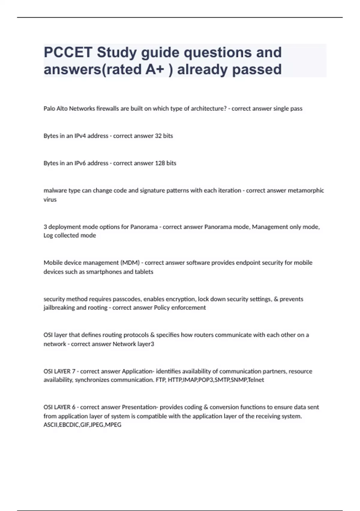 PCCET Study guide questions and answers(rated A+ ) already passedPalo Alto Networks firewalls are built on which type of architecture? - correct answer single pass Bytes in an IPv4 address - correct answer 32 bits Bytes in an IPv6 address - correct answer 128 bits malware type can change code and signature patterns with each iteration - correct answer metamorphic virus 3 deployment mode options for Panorama - correct answer Panorama mode, Management only mode, Log collected mode Mobile device management (MDM) - correct answer software provides endpoint security for mobile devices such as smartphones and tablets security method requires passcodes, enables encryption, lock down security settings, & prevents jailbreaking and rooting - correct answer Policy enforcement OSI layer that defines routing protocols & specifies how routers communicate with each other on a network - correct answer Network layer3 OSI LAYER 7 - correct answer Application- identifies availability of communication partners, resource availability, synchronizes communication. FTP, HTTP,IMAP,POP3,SMTP,SNMP,Telnet OSI LAYER 6 - correct answer Presentation- provides coding & conversion functions to ensure data sent from application layer of system is compatible with the application layer of the receiving system. ASCII,EBCDIC,GIF,JPEG,MPEG