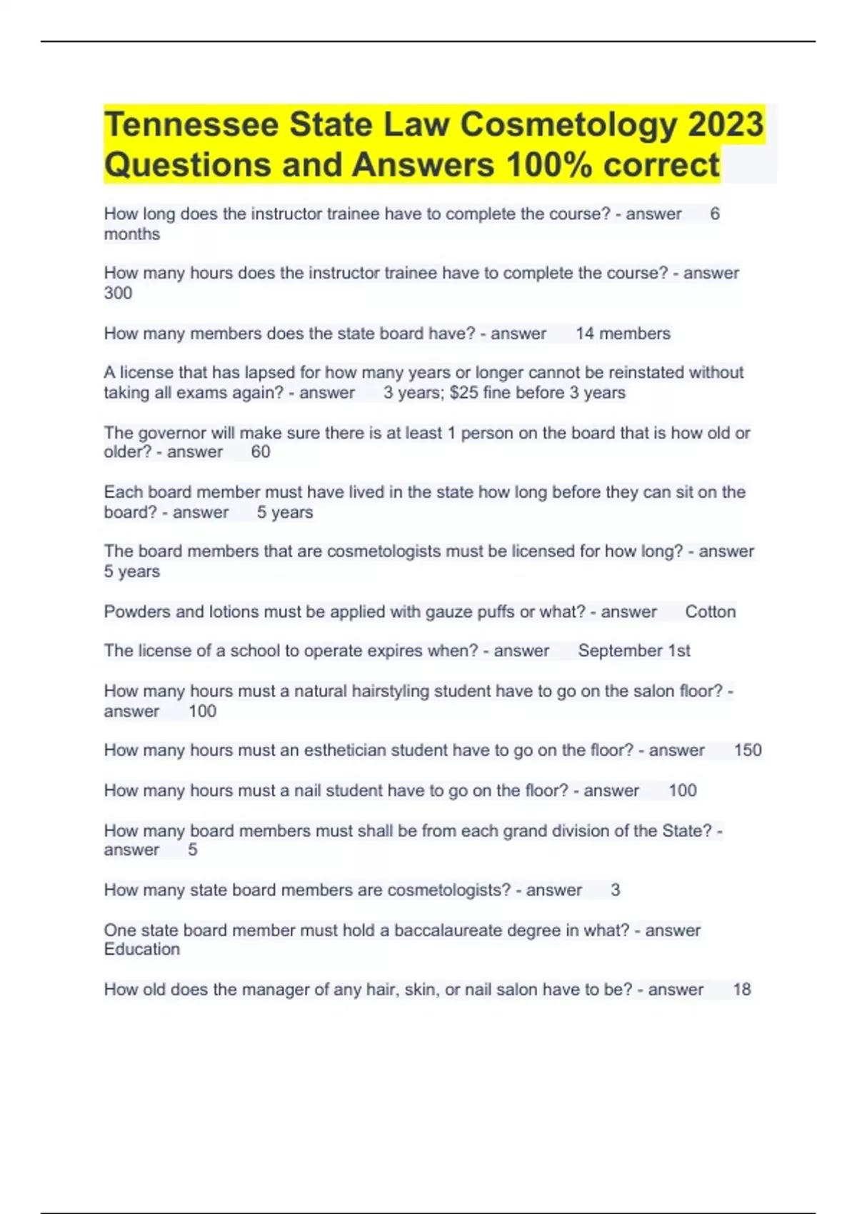 Tennessee State Law Cosmetology 2023 Questions and Answers 100% correct How long does the instructor trainee have to complete the course? 6 months How many hours does the instructor trainee have to complete the course? 300 How many members does the state board have? 14 members A license that has lapsed for how many years or longer cannot be reinstated without taking all exams again? 3 years; $25 fine before 3 years The governor will make sure there is at least 1 person on the board that is how old or older? 60 Each board member must have lived in the state how long before they can sit on the board? 5 years The board members that are cosmetologists must be licensed for how long? 5 years Powders and lotions must be applied with gauze puffs or what? Cotton The license of a school to operate expires when? September 1st How many hours must a natural hairstyling student have to go on the salon floor? 100 How many hours must an esthetician student have to go on the floor? 150 How many hours must a nail student have to go on the floor? 100 How many board members must shall be from each grand division of the State? 5 How many state board members are cosmetologists? 3 One state board member must hold a baccalaureate degree in what? Education How old does the manager of any hair, skin, or nail salon have to be? 18 Can a salon sell wine or beer to clients? No, it is prohibited. What product is prohibited by the U.S FDA in a hair, nail or skin care salon? Liquid methyl methacrylate (MMA) How many hours does a manicurist need to get their license? 600 How many hours does a natural hairstylist need to get their license? 300 Each school shall submit to the board a monthly progress report on each student by what day of the month? 10th What is the fee for all examinations in the state? It varies and is set by the contractor. What is the penalty for late renewal of a cosmetology license? $25 What is the fee to change a name on a license? $10 What is the fee for a lost or mutilated license? $25 What is the amount for an original cosmetology, nail or skin license? $60 What is the first thing a student must do before beginning service on a client? Wash their hands Every establishment must have a significant number of what? Covered trash cans Licensed estheticians can use alphahydroxy acid that does not exceed what percentage? 30% Alphahydroxy acid should have a pH of what or greater? 3.0 or higher When a disinfectant solution is put in a covered container, it is called _________? Dry sanitizer A very effective chemical used in wet sanitizer is called ________. Quats A cosmetologist may act as a junior instructor for no longer than _______ years. 3 A comb should not be kept in _______. Your uniform pocket Esthetics course requires _______ hours. 750 Every school will conspicuously display in the clinic area, a sign that reads __________________. All services in the school are performed by students only. High frequency electric current cannot be used in the coagulation of ________? Human tissue A school has to have at least _____ students enrolled. 20 To operate a school, there has to be a surety bond in the amount of $_______. $5,000 Anyone who is engaged in learning, performing or assisting in any practice of cosmetology under the immediate supervision of an instructor is called a ________? Student
