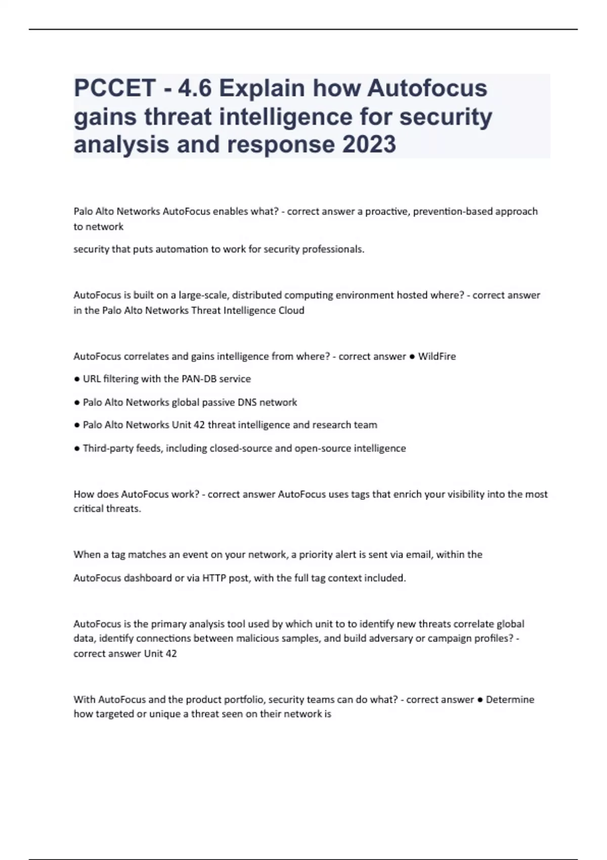 PCCET - 4.6 Explain how Autofocus gains threat intelligence for security analysis and response 2023Palo Alto Networks AutoFocus enables what? - correct answer a proactive, prevention-based approach to network security that puts automation to work for security professionals. AutoFocus is built on a large-scale, distributed computing environment hosted where? - correct answer in the Palo Alto Networks Threat Intelligence Cloud AutoFocus correlates and gains intelligence from where? - correct answer ● WildFire ● URL filtering with the PAN-DB service ● Palo Alto Networks global passive DNS network ● Palo Alto Networks Unit 42 threat intelligence and research team ● Third-party feeds, including closed-source and open-source intelligence How does AutoFocus work? - correct answer AutoFocus uses tags that enrich your visibility into the most critical threats. When a tag matches an event on your network, a priority alert is sent via email, within the AutoFocus dashboard or via HTTP post, with the full tag context included. AutoFocus is the primary analysis tool used by which unit to to identify new threats correlate global data, identify connections between malicious samples, and build adversary or campaign profiles? - correct answer Unit 42 With AutoFocus and the product portfolio, security teams can do what? - correct answer ● Determine how targeted or unique a threat seen on their network is ● Investigate related malicious samples ● Identify suspicious DNS queries with domain resolution history AutoFocus enables you to create new protections for the product portfolio by doing what? - correct answer by exporting high-value IoCs from the service into PAN-OS software External Dynamic Lists to instantly block malicious URLs, domains, and IP addresses. AutoFocus also can export IoCs to third-party security devices, how? - correct answer via a standard CSV format AutoFocus can dramatically reduce the time required to investigate by enriching third-party services through what? - correct answer ● Open API support ● Remote sweeping capability ● Support for STIX data format Why does AutoFocus supprt Open API? name one example - correct answer sending threat intelligence data to existing SIEM tools. Why does AutoFocus supprt Remote sweeping capability? name one example - correct answer Correlate third-party external systems directly from AutoFocus. What does"STIX" mean? - correct answer Structured Threat Information Expression What is "STIX"? - correct answer an Extensible Markup Language (XML) format for conveying data about