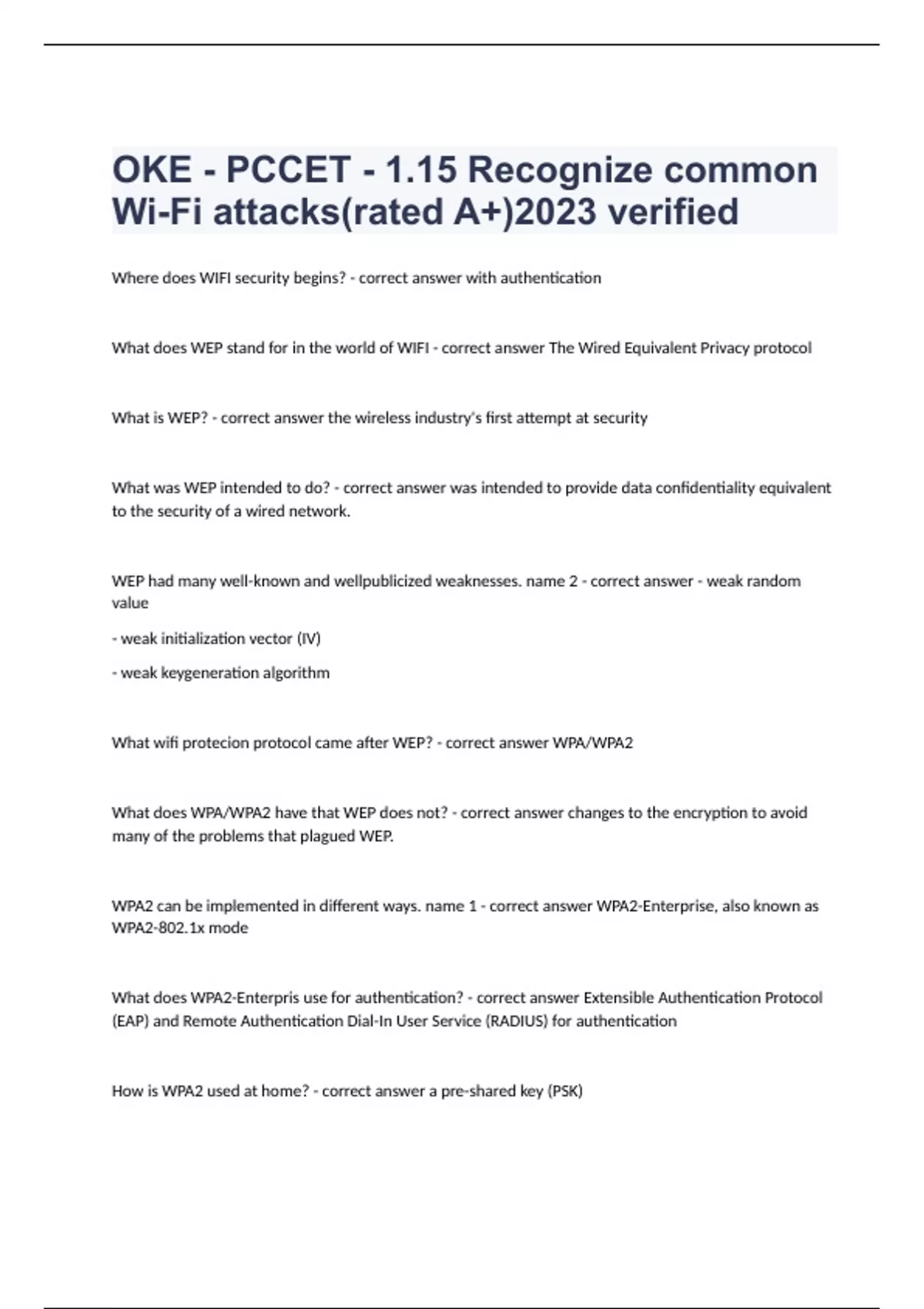 OKE - PCCET - 1.15 Recognize common Wi-Fi attacks(rated A+)2023 verifiedWhere does WIFI security begins? - correct answer with authentication What does WEP stand for in the world of WIFI - correct answer The Wired Equivalent Privacy protocol What is WEP? - correct answer the wireless industry's first attempt at security What was WEP intended to do? - correct answer was intended to provide data confidentiality equivalent to the security of a wired network. WEP had many well-known and wellpublicized weaknesses. name 2 - correct answer - weak random value - weak initialization vector (IV) - weak keygeneration algorithm What wifi protecion protocol came after WEP? - correct answer WPA/WPA2 What does WPA/WPA2 have that WEP does not? - correct answer changes to the encryption to avoid many of the problems that plagued WEP. WPA2 can be implemented in different ways. name 1 - correct answer WPA2-Enterprise, also known as WPA2-802.1x mode What does WPA2-Enterpris use for authentication? - correct answer Extensible Authentication Protocol (EAP) and Remote Authentication Dial-In User Service (RADIUS) for authentication How is WPA2 used at home? - correct answer a pre-shared key (PSK)