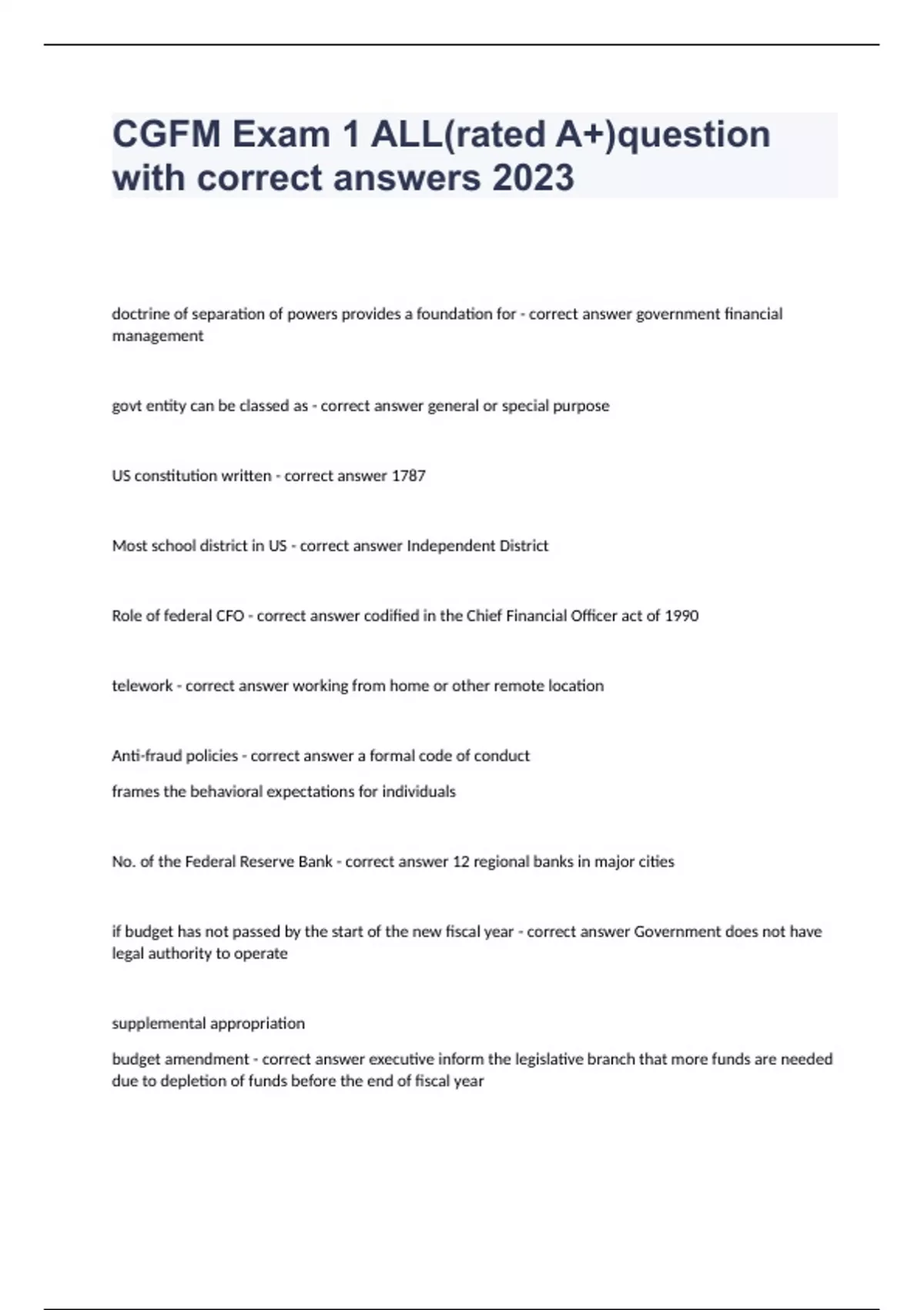 CGFM Exam 1 ALL(rated A+)question with correct answers 2023doctrine of separation of powers provides a foundation for - correct answer government financial management govt entity can be classed as - correct answer general or special purpose US constitution written - correct answer 1787 Most school district in US - correct answer Independent District Role of federal CFO - correct answer codified in the Chief Financial Officer act of 1990 telework - correct answer working from home or other remote location Anti-fraud policies - correct answer a formal code of conduct frames the behavioral expectations for individuals No. of the Federal Reserve Bank - correct answer 12 regional banks in major cities if budget has not passed by the start of the new fiscal year - correct answer Government does not have legal authority to operate supplemental appropriation budget amendment - correct answer executive inform the legislative branch that more funds are needed due to depletion of funds before the end of fiscal year most power in budget - correct answer legislative branch Appropriation of funds - correct answer budget bill that actually makes funds available Authorization of funds - correct answer bill that approves programs it prescribes what an agency will do if funding is available Expanded Government framework - correct answer includes these steps: planning, programming, budgeting, operations, accounting, reporting and auditing. Type of performance audit - correct answer o Program effectiveness and results audits address the effectiveness of a program and typically measure the extent to which a program is achieving its goals and objectives. o Economy and efficiency audit objectives concern whether an entity is acquiring, protecting and using its resources in the most productive manner to achieve program objectives. o Program effectiveness and results audit objectives, as well as economy and efficiency audit objectives, are often interrelated and may be concurrently addressed in a performance audit. major form of government revenue - correct answer tax progressive tax rate - correct answer income tax higher incomes, higher tax rate Tax expenditures - correct answer Exceptions to tax laws and regulations They cost the public in terms of lost revenue that could otherwise be used to fund programs or reduce tax rate 3 broad categories of tax - correct answer income Wealth Consumption