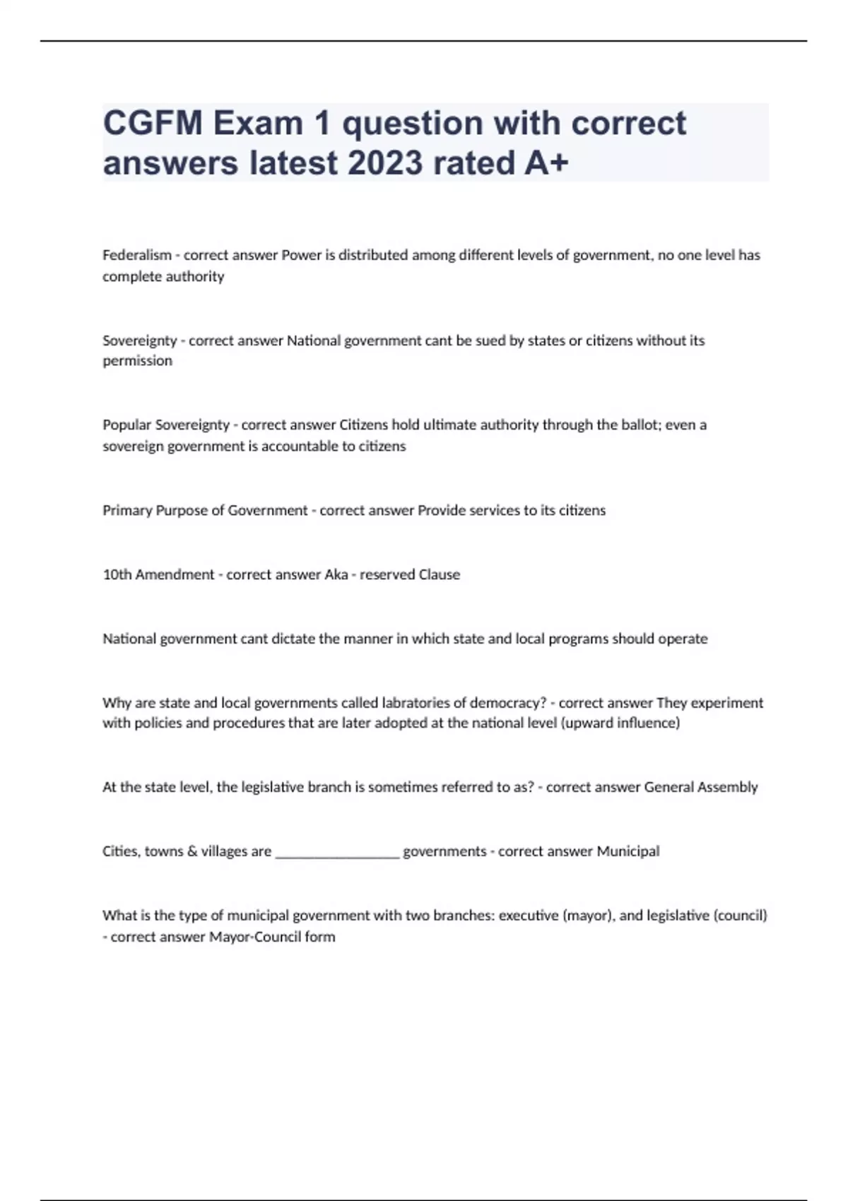 CGFM Exam 1 question with correct answers latest 2023 rated A+Federalism - correct answer Power is distributed among different levels of government, no one level has complete authority Sovereignty - correct answer National government cant be sued by states or citizens without its permission Popular Sovereignty - correct answer Citizens hold ultimate authority through the ballot; even a sovereign government is accountable to citizens Primary Purpose of Government - correct answer Provide services to its citizens 10th Amendment - correct answer Aka - reserved Clause National government cant dictate the manner in which state and local programs should operate Why are state and local governments called labratories of democracy? - correct answer They experiment with policies and procedures that are later adopted at the national level (upward influence) At the state level, the legislative branch is sometimes referred to as? - correct answer General Assembly Cities, towns & villages are ________________ governments - correct answer Municipal What is the type of municipal government with two branches: executive (mayor), and legislative (council) - correct answer Mayor-Council form