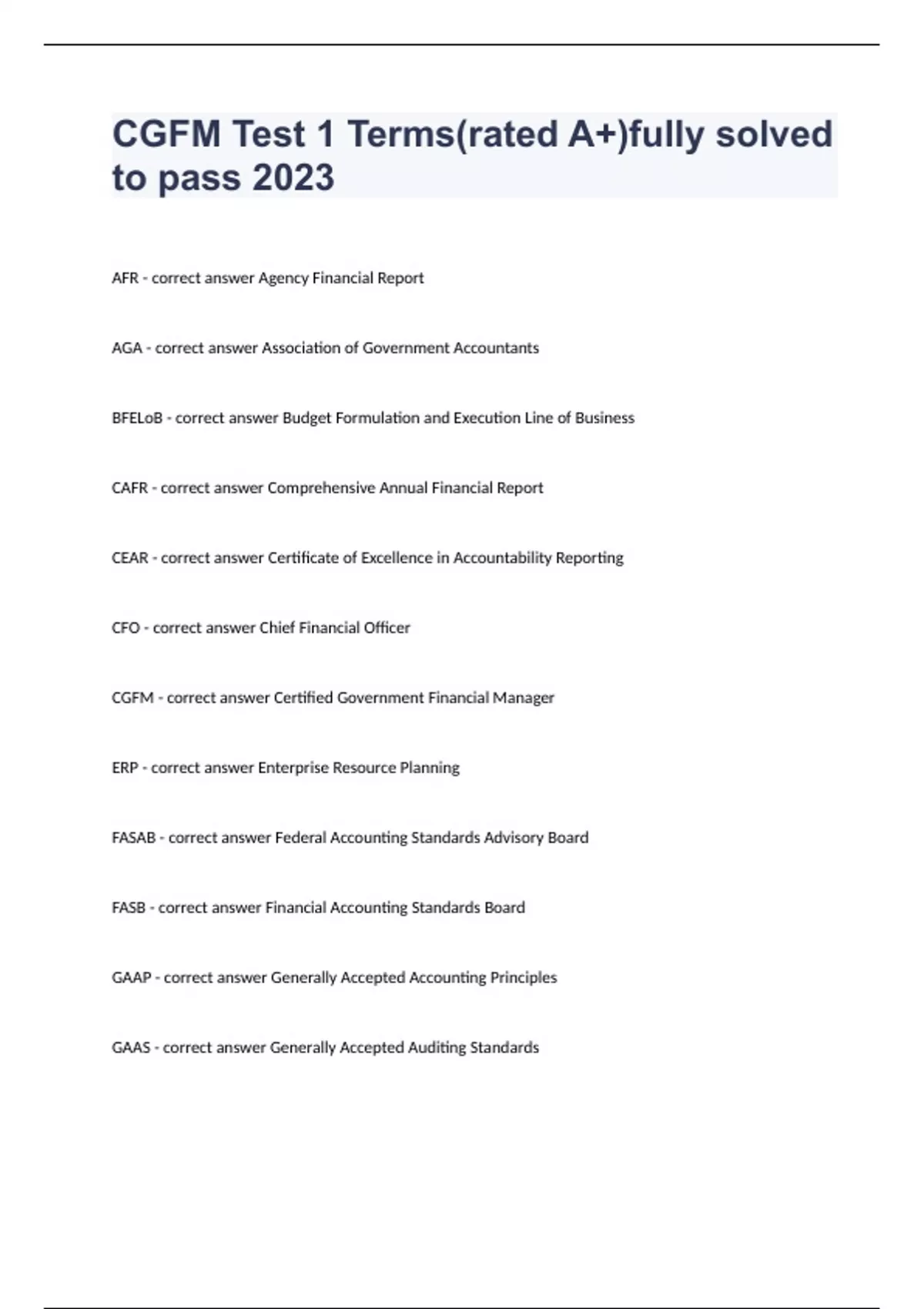 CGFM Test 1 Terms(rated A+)fully solved to pass 2023 AFR - correct answer Agency Financial Report AGA - correct answer Association of Government Accountants BFELoB - correct answer Budget Formulation and Execution Line of Business CAFR - correct answer Comprehensive Annual Financial Report CEAR - correct answer Certificate of Excellence in Accountability Reporting CFO - correct answer Chief Financial Officer CGFM - correct answer Certified Government Financial Manager ERP - correct answer Enterprise Resource Planning FASAB - correct answer Federal Accounting Standards Advisory Board FASB - correct answer Financial Accounting Standards Board GAAP - correct answer Generally Accepted Accounting Principles GAAS - correct answer Generally Accepted Auditing Standards