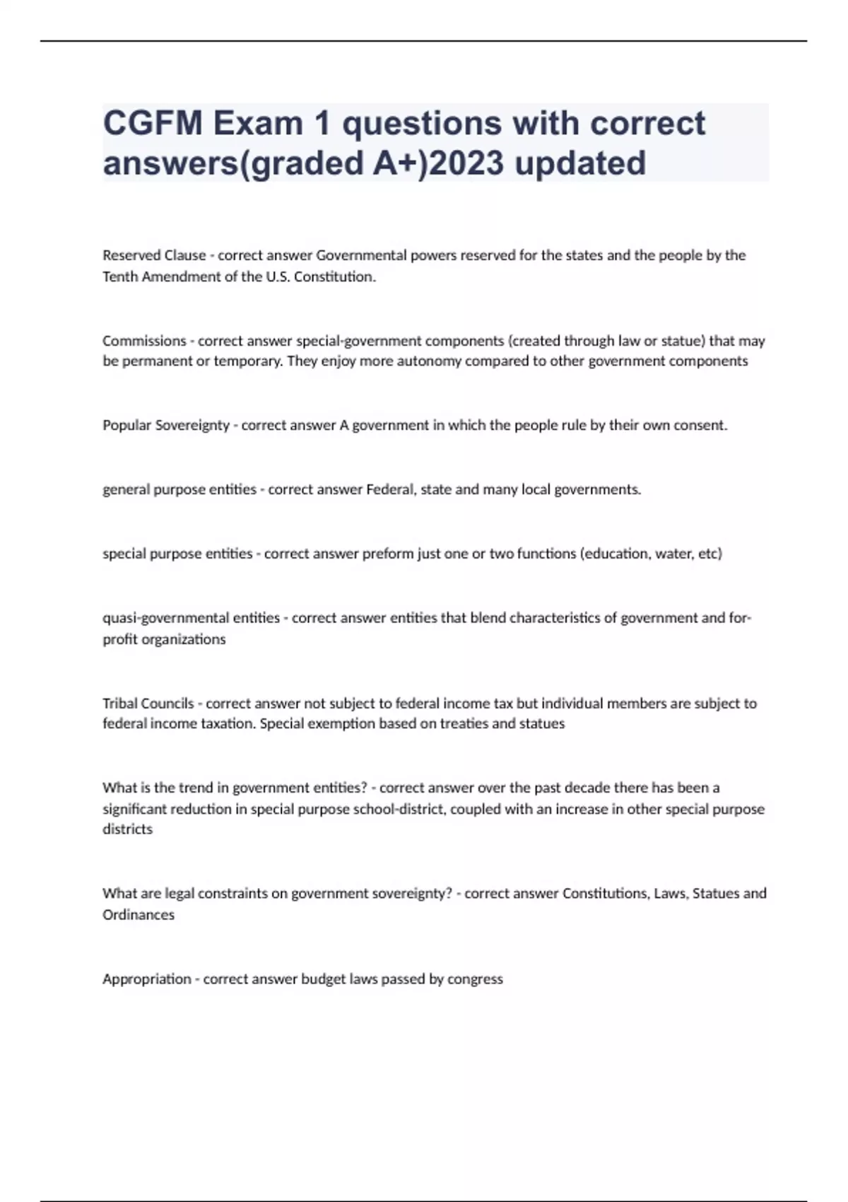 CGFM Exam 1 questions with correct answers(graded A+)2023 updatedReserved Clause - correct answer Governmental powers reserved for the states and the people by the Tenth Amendment of the U.S. Constitution. Commissions - correct answer special-government components (created through law or statue) that may be permanent or temporary. They enjoy more autonomy compared to other government components Popular Sovereignty - correct answer A government in which the people rule by their own consent. general purpose entities - correct answer Federal, state and many local governments. special purpose entities - correct answer preform just one or two functions (education, water, etc) quasi-governmental entities - correct answer entities that blend characteristics of government and for-profit organizations Tribal Councils - correct answer not subject to federal income tax but individual members are subject to federal income taxation. Special exemption based on treaties and statues What is the trend in government entities? - correct answer over the past decade there has been a significant reduction in special purpose school-district, coupled with an increase in other special purpose districts What are legal constraints on government sovereignty? - correct answer Constitutions, Laws, Statues and Ordinances Appropriation - correct answer budget laws passed by congress