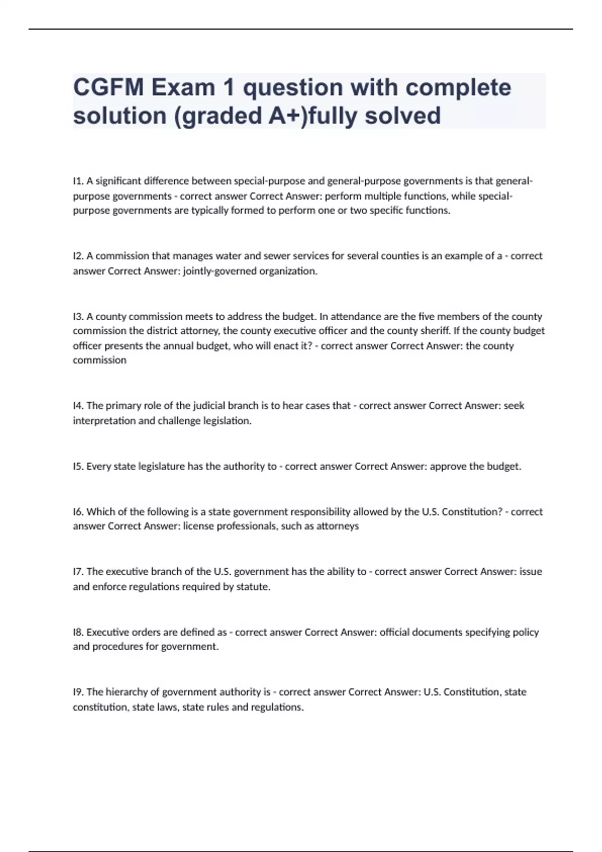 CGFM Exam 1 question with complete solution (graded A+)fully solved I1. A significant difference between special-purpose and general-purpose governments is that general-purpose governments - correct answer Correct Answer: perform multiple functions, while special-purpose governments are typically formed to perform one or two specific functions. I2. A commission that manages water and sewer services for several counties is an example of a - correct answer Correct Answer: jointly-governed organization. I3. A county commission meets to address the budget. In attendance are the five members of the county commission the district attorney, the county executive officer and the county sheriff. If the county budget officer presents the annual budget, who will enact it? - correct answer Correct Answer: the county commission I4. The primary role of the judicial branch is to hear cases that - correct answer Correct Answer: seek interpretation and challenge legislation. I5. Every state legislature has the authority to - correct answer Correct Answer: approve the budget. I6. Which of the following is a state government responsibility allowed by the U.S. Constitution? - correct answer Correct Answer: license professionals, such as attorneys I7. The executive branch of the U.S. government has the ability to - correct answer Correct Answer: issue and enforce regulations required by statute. I8. Executive orders are defined as - correct answer Correct Answer: official documents specifying policy and procedures for government. I9. The hierarchy of government authority is - correct answer Correct Answer: U.S. Constitution, state constitution, state laws, state rules and regulations. I10. The key principles in the relationship among the three branches of government include all of the following EXCEPT - correct answer Correct Answer: popular sovereignty. I11. The U.S. Constitution provides for separation of powers between which of the following? - correct answer Correct Answer: the president, the Supreme Court and Congress I12. Which of the following powers was granted exclusively to the federal government in the U.S. Constitution? - correct answer Correct Answer: to regulate commerce with Native American tribal governments I13. A conservation authority is established in a state to focus solely on swamp conservation efforts; the authority has the power to levy taxes. This is an example of which type of government? - correct answer Correct Answer: special-purpose district I14. The legislative branch of the U.S. government has the ability to - correct answer Correct Answer: limit government spending. I15. If a citizen complains about trash in a county park the responsibility for addressing the complaint resides with the - correct answer Correct Answer: county executive officer. I16. Regulations promulgated by federal agencies must comply with - correct answer Correct Answer: the U.S. Constitution, federal laws, and executive orders issued by the president. I17. A local government's authority is outlined in its constitution or - correct answer Correct Answer: charter. I18. A county-wide utility district is an example of a - correct answer Correct Answer: special-purpose government. I19. Several local school districts are forming a jointly-governed district to provide education services to disabled students in a central location. The primary reason for forming such an organization is to - correct answer Correct Answer: manage the program more effectively and efficiently.