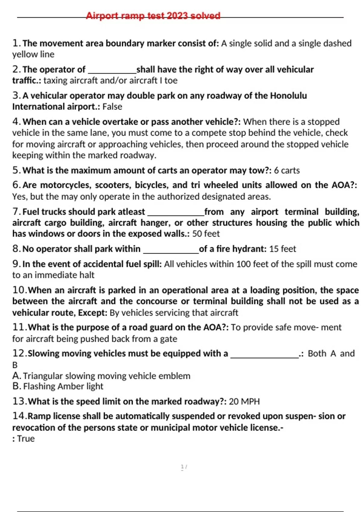 1. The movement area boundary marker consist of: A single solid and a single dashed yellow line 2. The operator of shall have the right of way over all vehicular traffic.: taxing aircraft and/or aircraft I toe 3. A vehicular operator may double park on any roadway of the Honolulu International airport.: False 4. When can a vehicle overtake or pass another vehicle?: When there is a stopped vehicle in the same lane, you must come to a compete stop behind the vehicle, check for moving aircraft or approaching vehicles, then proceed around the stopped vehicle keeping within the marked roadway. 5. What is the maximum amount of carts an operator may tow?: 6 carts 6. Are motorcycles, scooters, bicycles, and tri wheeled units allowed on the AOA?: Yes, but the may only operate in the authorized designated areas. 7. Fuel trucks should park atleast from any airport terminal building, aircraft cargo building, aircraft hanger, or other structures housing the public which has windows or doors in the exposed walls.: 50 feet 8. No operator shall park within of a fire hydrant: 15 feet 9. In the event of accidental fuel spill: All vehicles within 100 feet of the spill must come to an immediate halt 10. When an aircraft is parked in an operational area at a loading position, the space between the aircraft and the concourse or terminal building shall not be used as a vehicular route, Except: By vehicles servicing that aircraft 11. What is the purpose of a road guard on the AOA?: To provide safe move- ment for aircraft being pushed back from a gate 12. Slowing moving vehicles must be equipped with a .: Both A and B A. Triangular slowing moving vehicle emblem B. Flashing Amber light 13. What is the speed limit on the marked roadway?: 20 MPH 14. Ramp license shall be automatically suspended or revoked upon suspen- sion or revocation of the persons state or municipal motor vehicle license.- : True