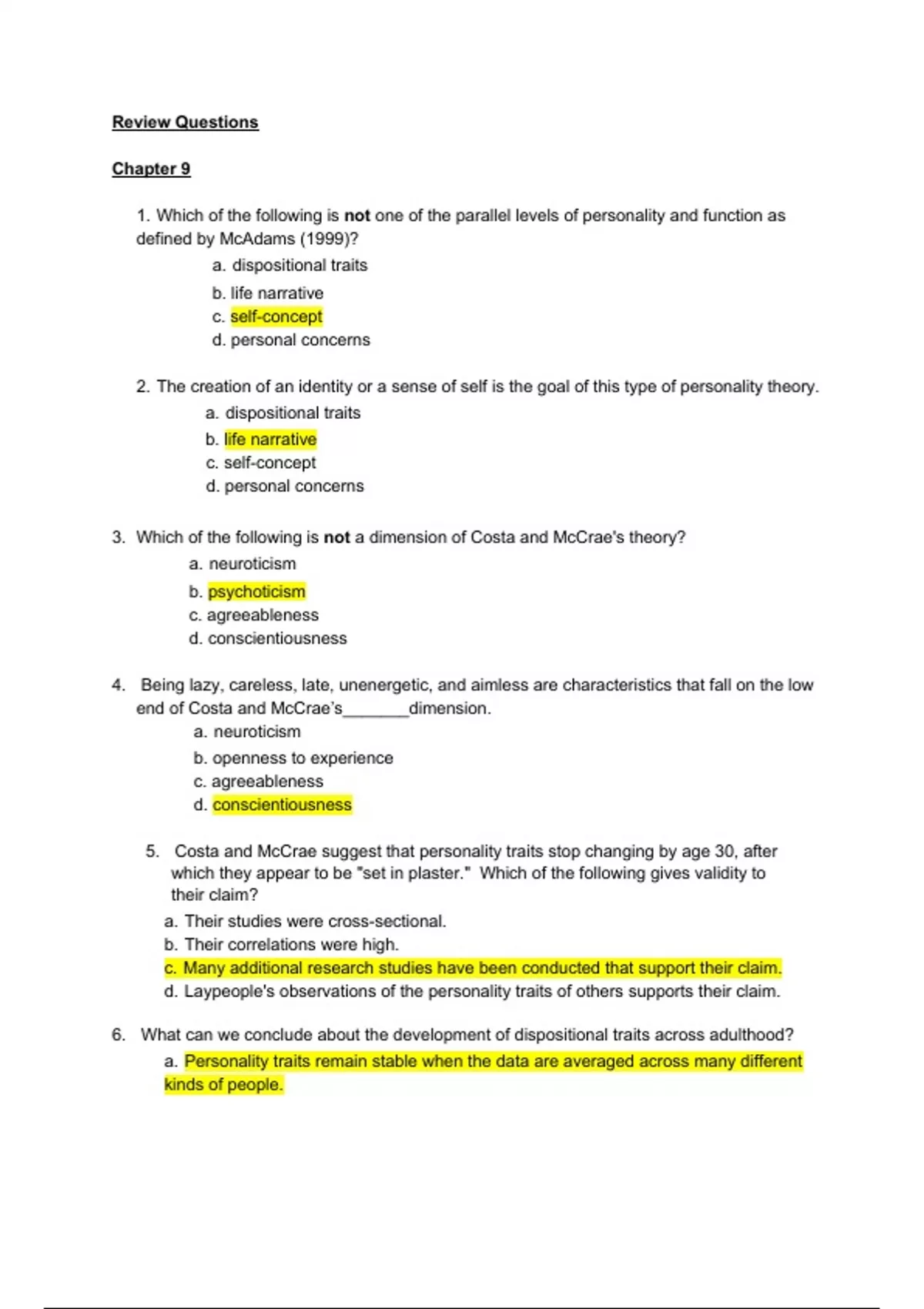 Review Questions Chapter 9 1. Which of the following is not one of the parallel levels of personality and function as defined by McAdams (1999)? a. dispositional traits b. life narrative c. self-concept d. personal concerns 2. The creation of an identity or a sense of self is the goal of this type of personality theory. a. dispositional traits b. life narrative c. self-concept d. personal concerns 3. Which of the following is not a dimension of Costa and McCrae's theory? a. neuroticism b. psychoticism c. agreeableness d. conscientiousness 4. Being lazy, careless, late, unenergetic, and aimless are characteristics that fall on the low end of Costa and McCrae’s_______dimension. a. neuroticism b. openness to experience c. agreeableness d. conscientiousness 5. Costa and McCrae suggest that personality traits stop changing by age 30, after which they appear to be "set in plaster." Which of the following gives validity to their claim? a. Their studies were cross-sectional. b. Their correlations were high. c. Many additional research studies have been conducted that support their claim. d. Laypeople's observations of the personality traits of others supports their claim. 6. What can we conclude about the development of dispositional traits across adulthood? a. Personality traits remain stable when the data are averaged across many different kinds of people. b. Personality traits remain stable but only when examining specific personality traits in specific kinds of people. c. When the data are averaged across many different kinds of people, the research overwhelmingly points to personality change over time. d. It has become apparent th