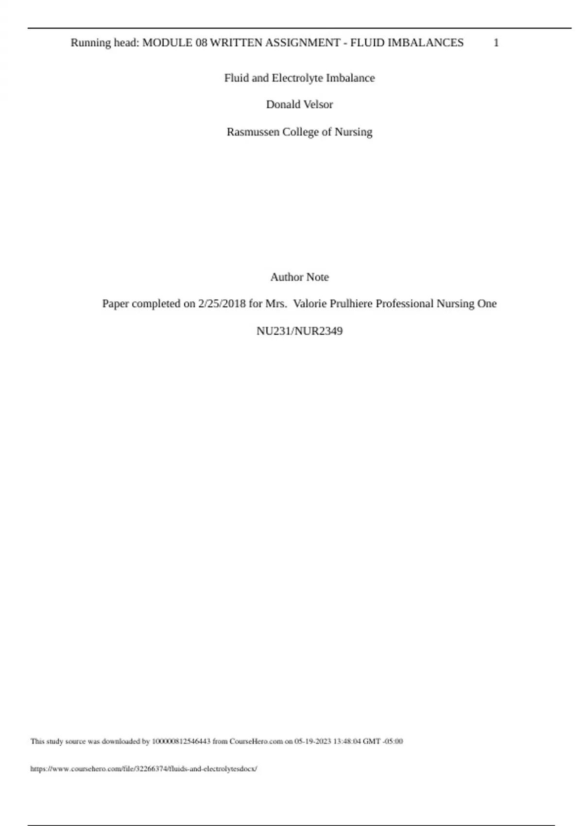 NUR 2349 MODULE 08 WRITTEN ASSIGNMENT - FLUID IMBALANCES 1 Fluid and Electrolyte Imbalance