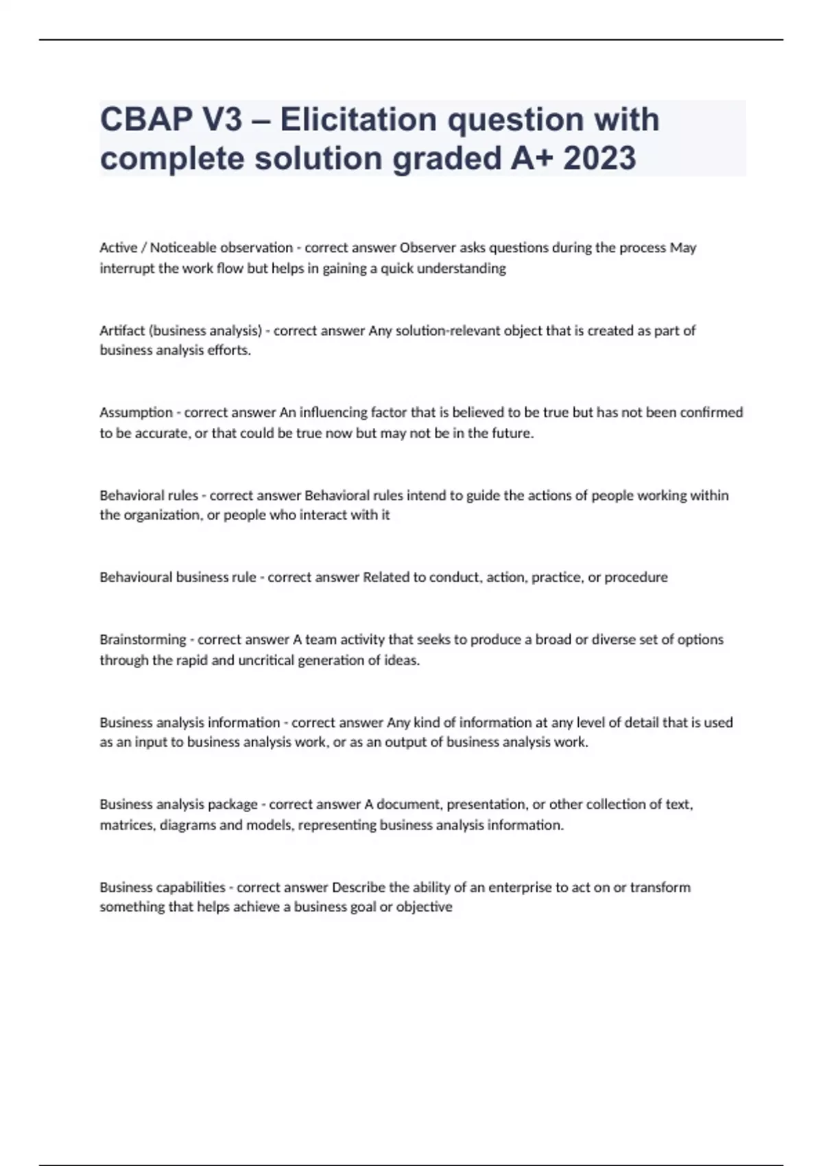 CBAP V3 – Elicitation question with complete solution graded A+ 2023Active / Noticeable observation - correct answer Observer asks questions during the process May interrupt the work flow but helps in gaining a quick understanding Artifact (business analysis) - correct answer Any solution-relevant object that is created as part of business analysis efforts. Assumption - correct answer An influencing factor that is believed to be true but has not been confirmed to be accurate, or that could be true now but may not be in the future. Behavioral rules - correct answer Behavioral rules intend to guide the actions of people working within the organization, or people who interact with it Behavioural business rule - correct answer Related to conduct, action, practice, or procedure Brainstorming - correct answer A team activity that seeks to produce a broad or diverse set of options through the rapid and uncritical generation of ideas. Business analysis information - correct answer Any kind of information at any level of detail that is used as an input to business analysis work, or as an output of business analysis work. Business analysis package - correct answer A document, presentation, or other collection of text, matrices, diagrams and models, representing business analysis information. Business capabilities - correct answer Describe the ability of an enterprise to act on or transform something that helps achieve a business goal or objective Business policy - correct answer A non-practicable directive that controls and influences the actions of an enterprise. Business process - correct answer An end-to-end set of activities Business requirement - correct answer A representation of goals, objectives and outcomes that describe why a change has been initiated and how success will be assessed. Business requirements - correct answer Goals, objectives and outcomes which indicate the reason for initiating a change Business rule - correct answer A specific, practicable, testable directive that is under the control of the business and that serves as a criterion for guiding behaviour, shaping judgments, or making decisions. Closed questions - correct answer Respondents select from available responses Typically Yes/No, multiple-choice, rank order decision etc Collaboration - correct answer Act of working together with other people towards accomplishing a common goal Collaboration and Knowledge Management Tools - correct answer Capture organization wide knowledge and makes it available and accessible to the entire team Collaborative games - correct answer Collaborative games use game playing techniques to collaborate in developing common understanding of a problem or a solution Compliance - correct answer Legal, financial or regulatory constraints which can differ based on the scenario Decision requirements diagram - correct answer Shows information, knowledge and decision making involved in a more complex business decision