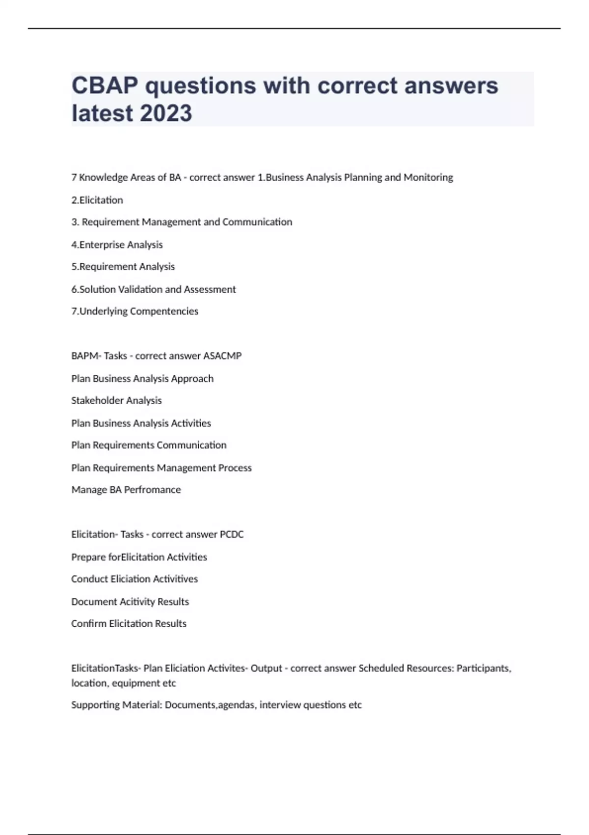 CBAP questions with correct answers latest 2023 7 Knowledge Areas of BA - correct answer 1.Business Analysis Planning and Monitoring 2.Elicitation 3. Requirement Management and Communication 4.Enterprise Analysis 5.Requirement Analysis 6.Solution Validation and Assessment 7.Underlying Compentencies BAPM- Tasks - correct answer ASACMP Plan Business Analysis Approach Stakeholder Analysis Plan Business Analysis Activities Plan Requirements Communication Plan Requirements Management Process Manage BA Perfromance Elicitation- Tasks - correct answer PCDC Prepare forElicitation Activities Conduct Eliciation Activitives Document Acitivity Results Confirm Elicitation Results ElicitationTasks- Plan Eliciation Activites- Output - correct answer Scheduled Resources: Participants, location, equipment etc Supporting Material: Documents,agendas, interview questions etc Elicitation Tasks - Plan Elicitation Activites - Input - correct answer ... Elicitation Tasks- Conduct Elicitation - output - correct answer Results from Elicitation Activity Elicitation Tasks - Document Elicitation Result - output - correct answer Requirements (stated) Stakeholder Concerns Elicitation Tasks- Document Elicication Results- input - correct answer ... Elicitation Tasks- Confirm Elicitation Results- Outputs - correct answer REquirements ( stated and confirmed) Stakeholder Concerns (confirmed) Elicitation Techniques - correct answer DIP of RIBS Document Analysis Interviews Prototyping Observation Focus Groups Requirement Workshop Interface Analysis Brainstorming Surveys Requirement Management &Communication- Tasks - correct answer STRPC Scope Management Manage Tracabilty Requirements Re-Use