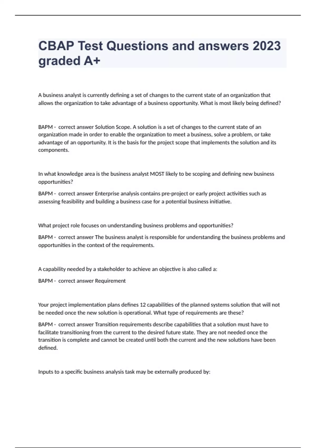 CBAP Test Questions and answers 2023 graded A+ A business analyst is currently defining a set of changes to the current state of an organization that allows the organization to take advantage of a business opportunity. What is most likely being defined? BAPM - correct answer Solution Scope. A solution is a set of changes to the current state of an organization made in order to enable the organization to meet a business, solve a problem, or take advantage of an opportunity. It is the basis for the project scope that implements the solution and its components. In what knowledge area is the business analyst MOST likely to be scoping and defining new business opportunities? BAPM - correct answer Enterprise analysis contains pre-project or early project activities such as assessing feasibility and building a business case for a potential business initiative. What project role focuses on understanding business problems and opportunities? BAPM - correct answer The business analyst is responsible for understanding the business problems and opportunities in the context of the requirements. A capability needed by a stakeholder to achieve an objective is also called a: BAPM - correct answer Requirement Your project implementation plans defines 12 capabilities of the planned systems solution that will not be needed once the new solution is operational. What type of requirements are these? BAPM - correct answer Transition requirements describe capabilities that a solution must have to facilitate transitioning from the current to the desired future state. They are not needed once the transition is complete and cannot be created until both the current and the new solutions have been defined. Inputs to a specific business analysis task may be externally produced by: BAPM - correct answer Single task. Inputs represent information and preconditions necessary for a take to begin. They are produced externally by a single task. In order to determine solutions to business problems, the business analyst applies a set of: BAPM - correct answer Business analysis is a set of business analysis