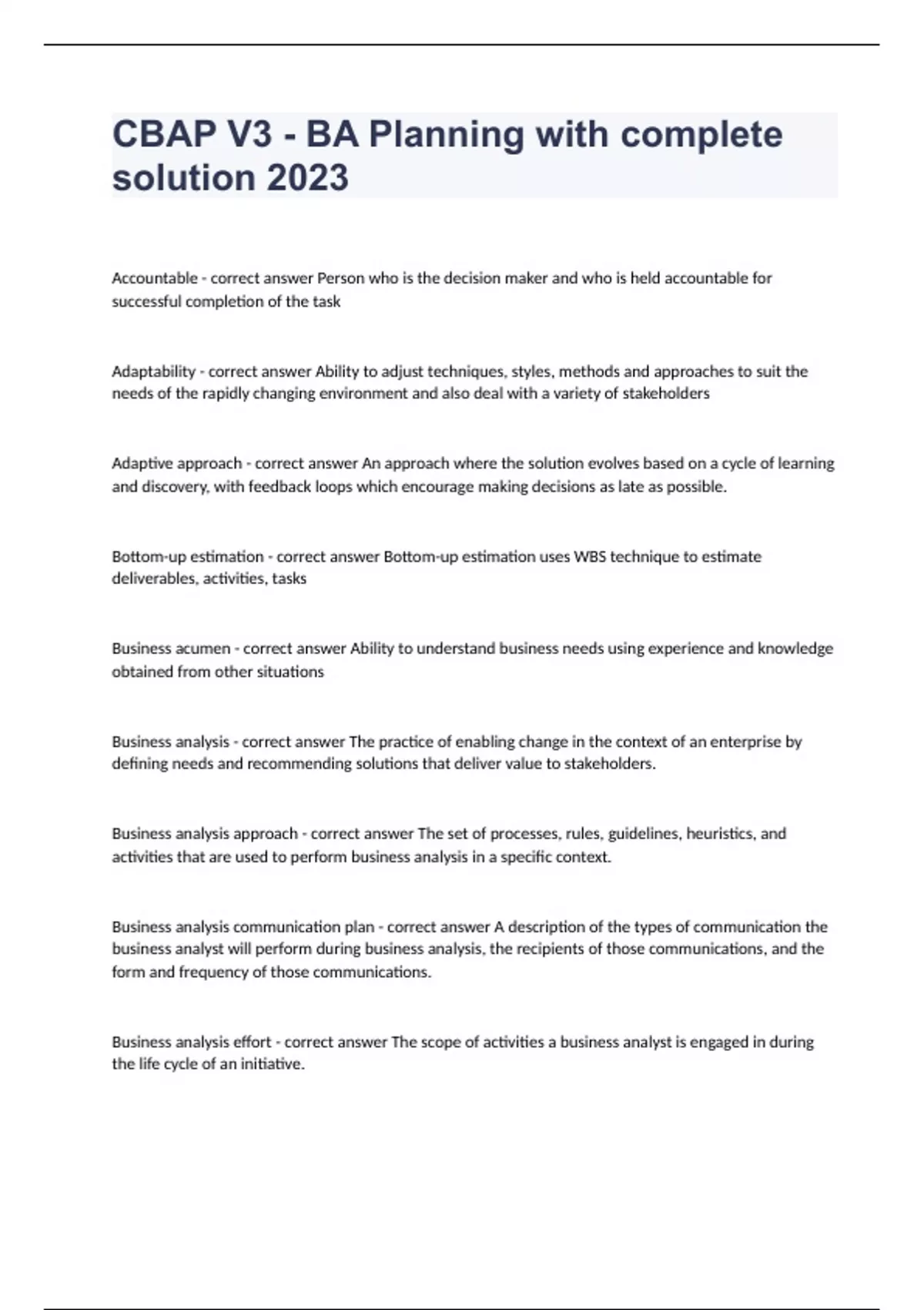 CBAP V3 - BA Planning with complete solution 2023Accountable - correct answer Person who is the decision maker and who is held accountable for successful completion of the task Adaptability - correct answer Ability to adjust techniques, styles, methods and approaches to suit the needs of the rapidly changing environment and also deal with a variety of stakeholders Adaptive approach - correct answer An approach where the solution evolves based on a cycle of learning and discovery, with feedback loops which encourage making decisions as late as possible. Bottom-up estimation - correct answer Bottom-up estimation uses WBS technique to estimate deliverables, activities, tasks Business acumen - correct answer Ability to understand business needs using experience and knowledge obtained from other situations Business analysis - correct answer The practice of enabling change in the context of an enterprise by defining needs and recommending solutions that deliver value to stakeholders. Business analysis approach - correct answer The set of processes, rules, guidelines, heuristics, and activities that are used to perform business analysis in a specific context. Business analysis communication plan - correct answer A description of the types of communication the business analyst will perform during business analysis, the recipients of those communications, and the form and frequency of those communications. Business analysis effort - correct answer The scope of activities a business analyst is engaged in during the life cycle of an initiative. Business analysis performance assessment - correct answer Comprises of a comparison of planned vs actual performance, Root cause analysis of deviation from the expected performance, ways to address issues etc Business analysis perspectives - correct answer 5 perspectives of business analysis described in BABoK - agile, business intelligence, information technology, business architecture, business process management Business analysis plan - correct answer A description of the planned activities the business analyst will execute in order to perform the business analysis work involved in a specific initiative. See also requirements management plan. Business analysis planning and monitoring - correct answer Tasks BAs perform to organize and coordinate efforts of BAs and stakeholders Business analysis roles - correct answer Roles which typically conduct business analysis work - business architect, system analyst, requirements engineer, process analyst, management consultant, product manager Business analysis tools and technology - correct answer Tools those provide specialized capabilities in creating models and visuals for the requirements Business analyst - correct answer Any person who performs business analysis, no matter their job title or organizational role. Business Process Dimension - correct answer Measures indicating how well the enterprise is operating and if its products meet customer needs Certification - correct answer Constraints on the solution which is necessary to meet certain standards or industry convention Change management - correct answer Planned activities, tools, and techniques to address the human side of change during a change initiative, primarily addressing the needs of the people who will be most affected by the change.