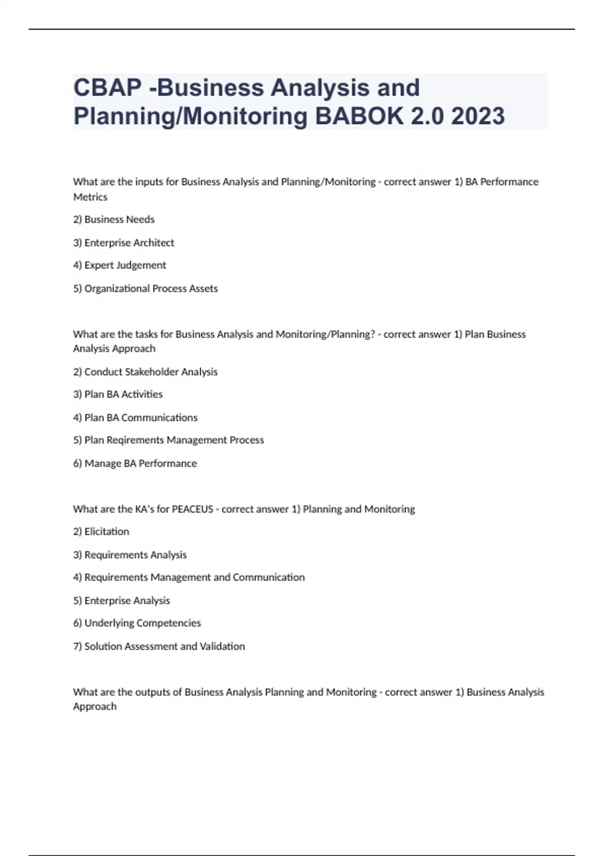 CBAP -Business Analysis and Planning/Monitoring BABOK 2.0 2023What are the inputs for Business Analysis and Planning/Monitoring - correct answer 1) BA Performance Metrics 2) Business Needs 3) Enterprise Architect 4) Expert Judgement 5) Organizational Process Assets What are the tasks for Business Analysis and Monitoring/Planning? - correct answer 1) Plan Business Analysis Approach 2) Conduct Stakeholder Analysis 3) Plan BA Activities 4) Plan BA Communications 5) Plan Reqirements Management Process 6) Manage BA Performance What are the KA's for PEACEUS - correct answer 1) Planning and Monitoring 2) Elicitation 3) Requirements Analysis 4) Requirements Management and Communication 5) Enterprise Analysis 6) Underlying Competencies 7) Solution Assessment and Validation What are the outputs of Business Analysis Planning and Monitoring - correct answer 1) Business Analysis Approach 2) BA Communication Plan 3) BA Performance Assessment 4) Business Analysis Plans 5) BA Process Assets 6) Requirements Management Plan 7) Stakeholder List, Roles and Responsibilities What are the inputs for Planning Business Analysis Approach? - correct answer 1) Business Needs 2) Expert Judgement 3) Organizational Process Assets What tasks use the Plan Business Analysis Approach? - correct answer 1) Plan BA Activities 2) Plan Reqirements Management Process What is the purpose of the Conduct Stakeholder Analysis? - correct answer 1) Identification of Stakeholders that are affected by change 2) Complete as soon as business need is identified 3) Ongoing activity as project continues What inputs are used for Stakeholder Analysis? - correct answer 1) Business Needs - Analyze position of Stakeholders affected by change 2) Enterprise Architecture - interactions with other orgs 3) Organizational Process Assets - policies or procedures, methodolgies, tempates What elements are factored into Stateholder Analysis - correct answer 1) who are stakeholders and the impact to them. 2) Complexity of stakeholder group 3) Attitudes and Influence 4) Authority levels for BA work