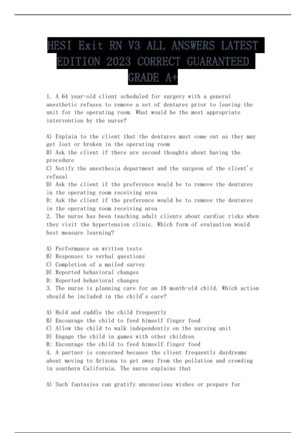 1. A 64 year-old client scheduled for surgery with a general anesthetic refuses to remove a set of dentures prior to leaving the unit for the operating room. What would be the most appropriate intervention by the nurse? A) Explain to the client that the dentures must come out as they may get lost or broken in the operating room B) Ask the client if there are second thoughts about having the procedure C) Notify the anesthesia department and the surgeon of the client's refusal D) Ask the client if the preference would be to remove the dentures in the operating room receiving area D: Ask the client if the preference would be to remove the dentures in the operating room receiving area 2. The nurse has been teaching adult clients about cardiac risks when they visit the hypertension clinic. Which form of evaluation would best measure learning? A) Performance on written tests B) Responses to verbal questions C) Completion of a mailed survey D) Reported behavioral changes D: Reported behavioral changes 3. The nurse is planning care for an 18 month-old child. Which action should be included in the child's care? A) Hold and cuddle the child frequently B) Encourage the child to feed himself finger food C) Allow the child to walk independently on the nursing unit D) Engage the child in games with other children B: Encourage the child to feed himself finger food 4. A partner is concerned because the client frequently daydreams about moving to Arizona to get away from the pollution and crowding in southern California. The nurse explains that A) Such fantasies can gratify unconscious wishes or prepare for anticipated future events B) Detaching or dissociating in this way postpones painful feelings C) This conversion or transferring of a mental conflict to a physical symptom can lead to marital conflict D) To isolate the feelings in this way reduces conflict within the client and with others A: Such fantasies can gratify unconscious wishes or prepare for anticipated future events 5. An appropriate goal for a client with anxiety would be to A) Ventilate anxious feelings to the nurse B) Establish contact with reality C) Learn self-help techniques D) Become desensitized to past trauma C: Learn self-help techniques 6. While the nurse is administering medications to a client, the client states "I do not want to take that medicine today." Which of the following responses by the nurse would be best? A) "That's OK, its all right to skip your medication now and then." B) "I will have to call your doctor and report this." C) "Is there a reason why you don't want to take your medicine?" D) "Do you understand the consequences of refusing your prescribed treatment?" C: "Is there a reason why you don't want to take your medicine?" 7. While caring for a client, the nurse notes a pulsating mass in the client's peri umbilical area. Which of the following assessments is appropriate for the nurse to perform? A) Measure the length of the mass B) Auscultate the mass C) Percuss the mass D) Palpate the mass B: Auscultate the mass 8. A client is admitted to the hospital with a history of confusion. The client has difficulty remembering recent events and becomes disoriented when away from home. Which statement would provide the best reality orientation for this client? A) "Good morning. Do you remember where you are?" B) "Hello. My name is Elaine Jones and I am your nurse for today." C) "How are you today? Remember, you're in the hospital." D) "Good morning. You're in the hospital. I am your nurse Elaine Jones." D: "Good morning. You're in the hospital. I am your nurse Elaine Jones." 9. The nurse is teaching the parents of a 3 month-old infant about nutrition. What is the main source of fluids for an infant until about 12 months of age? A) Formula or breast milk B) Dilute nonfat dry milk C) Warmed fruit juice D) Fluoridated tap water A: Formula or breast milk 10. The family of a 6 year-old with a fractured femur asks the nurse if the child's height will be affected by the injury. Which statement is true concerning long bone fractures in children? A) Growth problems will occur if the fracture involves the periosteum B) Epiphyseal fractures often interrupt a child's normal growth pattern C) Children usually heal very quickly, so growth problems are rare D) Adequate blood supply to the bone prevents growth delay after fractures B: Epiphyseal fractures often interrupt a child''s normal growth pattern 11. The nurse is assessing a client who states her last menstrual period was March 16, and she has missed one period. She reports episodes of nausea and vomiting. Pregnancy is confirmed by a urine test. What will the nurse calculate as the estimated date of delivery (EDD)? A) April 8 B) January 15 C) February 11 D) December 23 D: December 23 12. When screening children for scoliosis, at what time of development would the nurse expect early signs to appear? A) Prenatally on ultrasound B) In early infancy C) When the child begins to bear weight D) During the preadolescent growth spurt D: During the preadolescent growth spurt 00:02 01:20 13. A client with congestive heart failure is newly admitted to home health care. The nurse discovers that the client has not been following the prescribed diet. What would be the most appropriate nursing action? A) Discharge the client from home health care related to noncompliance B) Notify the health care provider of the client's failure to follow prescribed diet C) Discuss diet with the client to learn the reasons for not following the diet D) Make a referral to Meals-on-Wheels C: Discuss diet with client to learn the reasons for not following the diet 14. A client states, "People think I'm no good, you know what I mean?" Which of these responses would be most therapeutic? A) "Well people often take their own feelings of inadequacy out on others." B) "I think you're good. So you see, there's one person who likes you." C) "I'm not sure what you mean. Tell me a bit more about that." D) "Let's discuss th