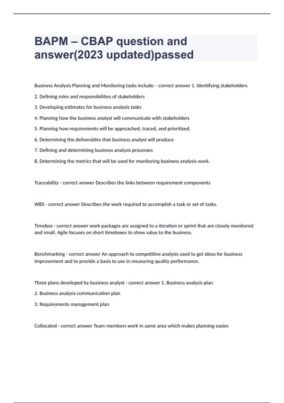 BAPM – CBAP question and answer(2023 updated)passedBusiness Analysis Planning and Monitoring tasks include: - correct answer 1. Identifying stakeholders 2. Defining roles and responsibilities of stakeholders 3. Developing estimates for business analysis tasks 4. Planning how the business analyst will communicate with stakeholders 5. Planning how requirements will be approached, traced, and prioritized. 6. Determining the deliverables that business analyst will produce 7. Defining and determining business analysis processes 8. Determining the metrics that will be used for monitoring business analysis work. Traceability - correct answer Describes the links between requirement components WBS - correct answer Describes the work required to accomplish a task or set of tasks. Timebox - correct answer work packages are assigned to a iteration or sprint that are closely monitored and small. Agile focuses on short timeboxes to show value to the business. Benchmarking - correct answer An approach to competitive analysis used to get ideas for business improvement and to provide a basis to use in measuring quality performance. Three plans developed by business analyst - correct answer 1. Business analysis plan 2. Business analysis communication plan 3. Requirements management plan Collocated - correct answer Team members work in same area which makes planning easier. Requirements attributes - correct answer characteristics of requirements, such as owner, author, priority and volatility. Who determines what BABOK Guide tasks are appropriate for their project? - correct answer Business analysis team Business Analysis stakeholders - correct answer 1. Participate in business analysis tasks 2. Have a vested interest in the project and its outcome 3. They interact with the business analyst in specific ways They do not 1. They are a set of roles that must be filled for the project