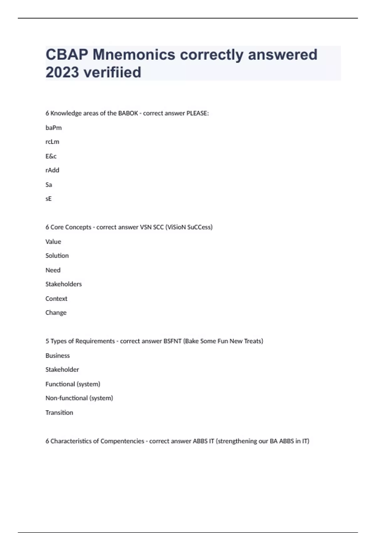 CBAP Mnemonics correctly answered 2023 6 Knowledge areas of the BABOK - correct answer PLEASE: baPm rcLm E&c rAdd Sa sE 6 Core Concepts - correct answer VSN SCC (ViSioN SuCCess) Value Solution Need Stakeholders Context Change 5 Types of Requirements - correct answer BSFNT (Bake Some Fun New Treats) Business Stakeholder Functional (system) Non-functional (system) Transition 6 Characteristics of Compentencies - correct answer ABBS IT (strengthening our BA ABBS in IT) Analytical thinking and problem solving Behavioral characteristics Business Knowledge communication Skills Interaction skills Tools and technology 5 compentencies in "Business Knowledge" - correct answer BIOS-M Business acumen Industry knowledge Organization knowledge Solution knowledge Methodology knowledge 3 compentencies in Tools and Technology - correct answer COB Communication Office productivity Business analysis BAPM - correct answer Business Analysis Planning and Monitoring Business Anlysis Planning and Monitoring tasks - correct answer ASGIP (thinking of planning "AS Getting Improved Performance.") plan the business analysis Approach plan Stakeholder engagement plan business analysis Governance plan business analysis Information management