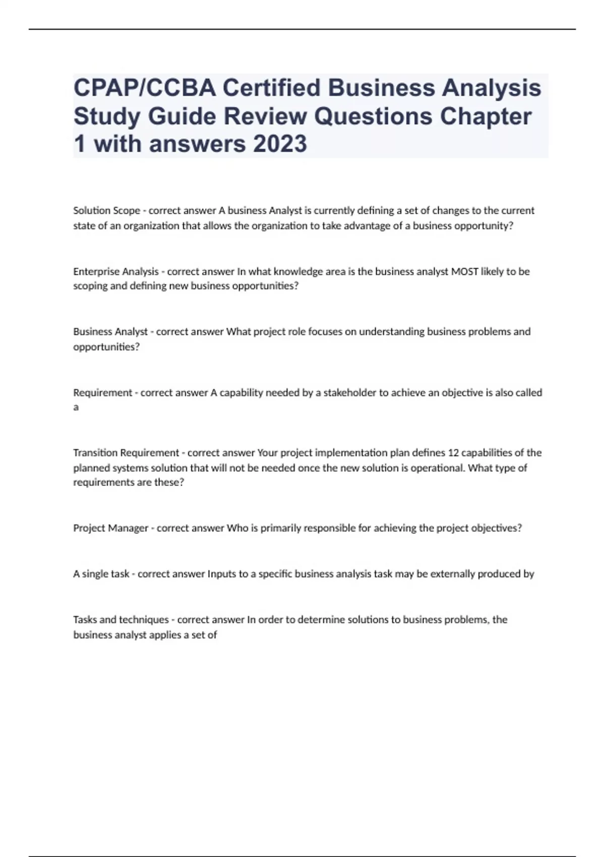 CPAP/CCBA Certified Business Analysis Study Guide Review Questions Chapter 1 with answers 2023Solution Scope - correct answer A business Analyst is currently defining a set of changes to the current state of an organization that allows the organization to take advantage of a business opportunity? Enterprise Analysis - correct answer In what knowledge area is the business analyst MOST likely to be scoping and defining new business opportunities? Business Analyst - correct answer What project role focuses on understanding business problems and opportunities? Requirement - correct answer A capability needed by a stakeholder to achieve an objective is also called a Transition Requirement - correct answer Your project implementation plan defines 12 capabilities of the planned systems solution that will not be needed once the new solution is operational. What type of requirements are these? Project Manager - correct answer Who is primarily responsible for achieving the project objectives? A single task - correct answer Inputs to a specific business analysis task may be externally produced by Tasks and techniques - correct answer In order to determine solutions to business problems, the business analyst applies a set of