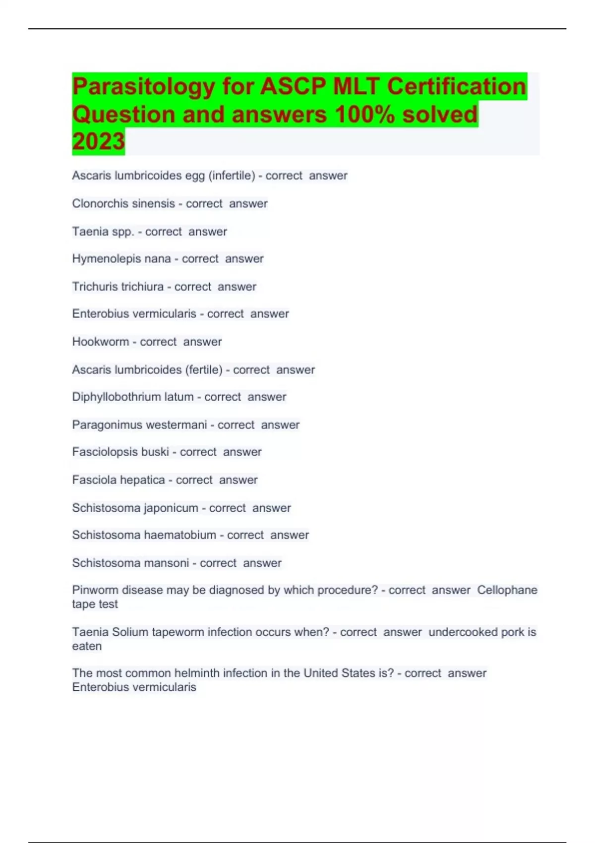 Parasitology for ASCP MLT Certification Question and answers 100% solved 2023Ascaris lumbricoides egg (infertile) Clonorchis sinensis Taenia spp. Hymenolepis nana Trichuris trichiura Enterobius vermicularis Hookworm Ascaris lumbricoides (fertile) Diphyllobothrium latum Paragonimus westermani Fasciolopsis buski Fasciola hepatica Schistosoma japonicum Schistosoma haematobium Schistosoma mansoni Pinworm disease may be diagnosed by which procedure? Cellophane tape test Taenia Solium tapeworm infection occurs when? undercooked pork is eaten The most common helminth infection in the United States is? Enterobius vermicularis The definitive host for Plasmodium vivax is a? Mosquito Clonorchis sinensis is commonly known as the? Chinese liver fluke The most pathogenic ameba in humans is? Entamoeba histolytica Which of the following may be used to culture amoebae in the laboratory? balamuth fluid Xenodiagnosis is used for which parasite? Trypanosoma cruzi Diptera is an order of insects including which of the following Mosquitoes The common name for Necator americanus is? hookworm Dwarf tapeworm disease Hymenolepis nana Threadworm disease Strongyloides stercoralis Traveler's diarrhea Giardia lamblia Liver rot Fasciola hepatica Whipworm disease Trichuris trichiura Vector any arthropod or other living carrier that transports a pathogenic microorganism from an infected host to a non-infected host Proglottid one of the segments of a tapeworm, each contains male and female reproductive organs when mature Host The species of an animal or plant that harbors a parasite and provides some metabolic resources for the parasite species Definitive host parasite that reaches sexual maturity