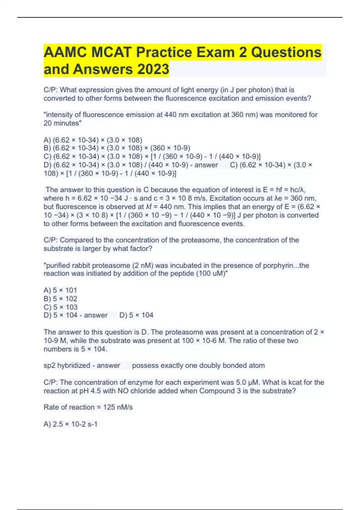 AAMC MCAT Practice Exam 2 Questions and Answers 2023 C/P: What expression gives the amount of light energy (in J per photon) that is converted to other forms between the fluorescence excitation and emission events? "intensity of fluorescence emission at 440 nm excitation at 360 nm) was monitored for 20 minutes" A) (6.62 × 10-34) × (3.0 × 108) B) (6.62 × 10-34) × (3.0 × 108) × (360 × 10-9) C) (6.62 × 10-34) × (3.0 × 108) × [1 / (360 × 10-9) - 1 / (440 × 10-9)] D) (6.62 × 10-34) × (3.0 × 108) / (440 × 10-9) C) (6.62 × 10-34) × (3.0 × 108) × [1 / (360 × 10-9) - 1 / (440 × 10-9)] The answer to this question is C because the equation of interest is E = hf = hc/λ, where h = 6.62 × 10 −34 J ∙ s and c = 3 × 10 8 m/s. Excitation occurs at λe = 360 nm, but fluorescence is observed at λf = 440 nm. This implies that an energy of E = (6.62 × 10 −34) × (3 × 10 8) × [1 / (360 × 10 −9) − 1 / (440 × 10 −9)] J per photon is converted to other forms between the excitation and fluorescence events. C/P: Compared to the concentration of the proteasome, the concentration of the substrate is larger by what factor? "purified rabbit proteasome (2 nM) was incubated in the presence of porphyrin...the reaction was initiated by addition of the peptide (100 uM)" A) 5 × 101 B) 5 × 102 C) 5 × 103 D) 5 × 104 D) 5 × 104 The answer to this question is D. The proteasome was present at a concentration of 2 × 10-9 M, while the substrate was present at 100 × 10-6 M. The ratio of these two numbers is 5 × 104. sp2 hybridized possess exactly one doubly bonded atom C/P: The concentration of enzyme for each experiment was 5.0 μM. What is kcat for the reaction at pH 4.5 with NO chloride added when Compound 3 is the substrate? Rate of reaction = 125 nM/s A) 2.5 × 10-2 s-1 B) 1.3 × 102 s-1 C) 5.3 × 103 s-1 D) 7.0 × 105 s-1 A) 2.5 × 10-2 s-1 The answer to this question is A. The fact that the rate of product formation did not vary over time for the first 5 minutes implies that the enzyme was saturated with substrate. Under these conditions, kcat = Vmax/[E] = (125 nM/s)/5.0 μM = 2.5 × 10-2 s-1. kcat, Vmax, [E] kcat = Vmax/[E] C/P: Absorption of ultraviolet light by organic molecules always results in what process? A) Bond breaking B) Excitation of bound electrons C) Vibration of atoms in polar bonds D) Ejection of bound electrons B) Excitation of bound electrons The answer to this question is B. The absorption of ultraviolet light by organic molecules always results in electronic excitation. Bond breaking can subsequently result, as can ionization or bond vibration, but none of these processes are guaranteed to result from the absorption of ultraviolet light. C/P: Four organic compounds: 2-butanone, n-pentane, propanoic acid, and n-butanol, present as a mixture, are separated by column chromatography using silica gel with benzene as the eluent. What is the expected order of elution of these four organic compounds from first to last? A) n-Pentane → 2-butanone → n-butanol → propanoic acid B) n-Pentane → n-butanol → 2-butanone → propanoic acid C) Propanoic acid → n-butanol → 2-butanone → n-pentane D) Propanoic acid → 2-butanone → n-butanol → n-pentane A) n-Pentane → 2-butanone → n-butanol → propanoic acid The answer to this question is A. The four compounds have comparable molecular weights, so the order of elution will depend on the polarity of the molecule. Since silica gel serves as the stationary phase for the experiment, increasing the polarity of the eluting molecule will increase its affinity for the stationary phase and increase the elution time (decreased Rf). C/P: The half-life of a radioactive material is: A) half the time it takes for all of the radioactive nuclei to decay into radioactive nuclei. B) half the time it takes for all of the radioactive nuclei to decay into their daughter nuclei. C) the time it takes for half of all the radioactive nuclei to decay into radioactive nuclei. D) the time it takes for half of all the radioactive nuclei to decay into their daughter nuclei. D) the time it takes for half of all the radioactive nuclei to decay into their daughter nuclei. The answer to this question is D because the half-life of a radioactive material is defined as the time it takes for half of all the radioactive nuclei to decay into their daughter nuclei, which may or may not also be radioactive. C/P: A person is sitting in a chair. Why must the person either lean forward or slide their feet under the chair in order to stand up? A) to increase the force required to stand up B) to use the friction with the ground C) to reduce the energy required to stand up D) to keep the body in equilibrium while rising D) to keep the body in equilibrium while rising The answer to this question is D because as the person is attempting to stand, the only support comes from the feet on the ground. The person is in equilibrium only when the center of mass is directly above their feet. Otherwise, if the person did not lean forward or slide the feet under the chair, the person would fall backward due to the large torque created by the combination of the weight of the body (applied at the person's center of mass) and the distance along the horizontal between the center of mass and the support point. C/P: The side chain of tryptophan will give rise to the largest CD signal in the near UV region when: A) present as a free amino acid B) part of an a-helix C) part of a B-sheet D) part of a fully folded protein D) part of a fully folded protein The answer to this question is D because tryptophan has an aromatic side chain that will give rise to a significant CD signal in the near UV region if it is found in a fully folded protein. C/P: Which amino acid will contribute to the CD signal in the far UV region, but NOT the near UV region, when part of a fully folded protein? "Asymmetry resulting from tertiary structural features causes the largest increase in CD s