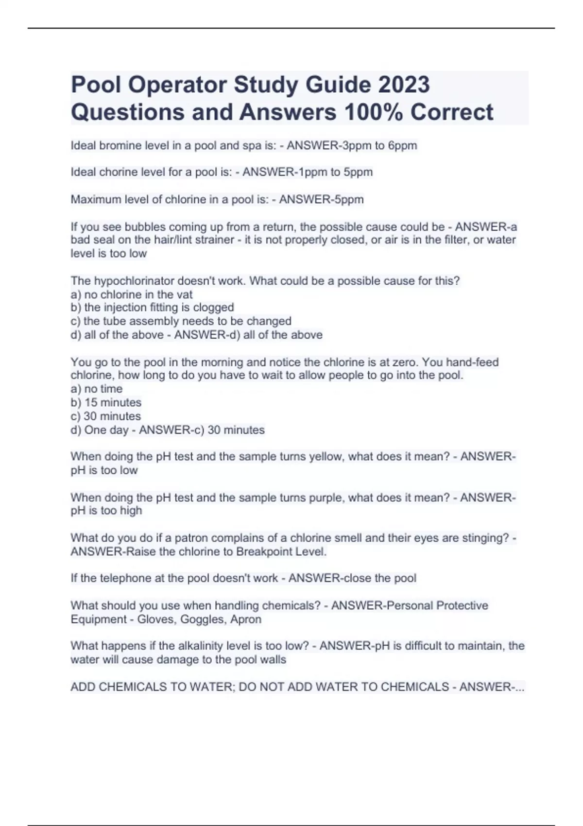 Pool Operator Study Guide 2023 Questions and Answers 100% CorrectPool Operator Study Guide 2023 Questions and Answers 100% CorrectPool Operator Study Guide 2023 Questions and Answers 100% CorrectIdeal bromine level in a pool and spa is: - ANSWER-3ppm to 6ppm Ideal chorine level for a pool is: - ANSWER-1ppm to 5ppm Maximum level of chlorine in a pool is: - ANSWER-5ppm If you see bubbles coming up from a return, the possible cause could be - ANSWER-a bad seal on the hair/lint strainer - it is not properly closed, or air is in the filter, or water level is too low The hypochlorinator doesn't work. What could be a possible cause for this? a) no chlorine in the vat b) the injection fitting is clogged c) the tube assembly needs to be changed d) all of the above - ANSWER-d) all of the above You go to the pool in the morning and notice the chlorine is at zero. You hand-feed chlorine, how long to do you have to wait to allow people to go into the pool. a) no time b) 15 minutes c) 30 minutes d) One day - ANSWER-c) 30 minutes When doing the pH test and the sample turns yellow, what does it mean? - ANSWER-pH is too low