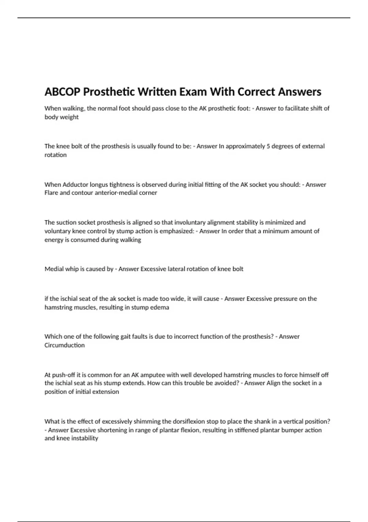 When walking, the normal foot should pass close to the AK prosthetic foot: - Answer to facilitate shift of body weight The knee bolt of the prosthesis is usually found to be: - Answer In approximately 5 degrees of external rotation When Adductor longus tightness is observed during initial fitting of the AK socket you should: - Answer Flare and contour anterior-medial corner The suction socket prosthesis is aligned so that involuntary alignment stability is minimized and voluntary knee control by stump action is emphasized: - Answer In order that a minimum amount of energy is consumed during walking Medial whip is caused by - Answer Excessive lateral rotation of knee bolt if the ischial seat of the ak socket is made too wide, it will cause - Answer Excessive pressure on the hamstring muscles, resulting in stump edema Which one of the following gait faults is due to incorrect function of the prosthesis? - Answer Circumduction At push-off it is common for an AK amputee with well developed hamstring muscles to force himself off the ischial seat as his stump extends. How can this trouble be avoided? - Answer Align the socket in a position of initial extension What is the effect of excessively shimming the dorsiflexion stop to place the shank in a vertical position? - Answer Excessive shortening in range of plantar flexion, resulting in stiffened plantar bumper action and knee instability During swing phase, a tendency for the AK prosthetic shin to make a marked inward movement of the knee accompanied by an outward movement of the foot is called: - Answer Lateral whip When hamstring muscle tightness is observed during initial fitting of the AK socket you sould: - Answer Roll and relieve the medial posterior wall Patient weighs 200 lbs. The length of the lever arm between center of gravity and support point on his socket is 6 inches. The length of the lever arm form support point to midpoint of femur is 10 inches. How many inch pounds of force must be distributed on his femur to prevent ML instability? - Answer 1200 The Latissimus dorsi and the supraspinatus are the prime movers in the glenohumeral extension: T/F - Answer False If a patient with 65% length BE can flex elbow to 90, the use of a step-up hinge is indicated: T/F - Answer True The rhomboids originate on: - Answer Thoracic vertebrae and insert along the scapula from the root of the spine to the inferior angle External rotation of humerus is accomplished with the: - Answer Infraspinatus & Teres Minor Internal rotation of the humerus is produced by contraction of the: - Answer Subscapularis The greatest disadvantage to the amputee in using any step-up hinge is: - Answer loss of flexion power in forearm The triceps not only extends the elbow joint but also: - Answer Extends the glenohumeral joint The shoulder disarticulation prosthesis is operated primarily by what control motion? - Answer Scapular abduction If the AE Amputee is having difficulty in flexing the elbow of his prosthesis he would be aided least by: - Answer Replacing a steel hook with an aluminum one The lever type excursion amplifier provides increased excursion at the expense of - Answer Force External-moveable-sheave-type excursion amplifier is used with what type of prosthesis? - Answer Shoulder Disarticulation What does the nudge control enable the amputee to do? - Answer Lock and unlock the elbow by pressing lever with the chin When making a plaster wrap for a VSBE split socket or Meunster, the elbow is flexed: - Answer 90 degrees What is the chief advantage of using the housing cross bar assembly? - Answer Enables the amputee to use the same cable to lock the elbow and operate the terminal device When using the single pivot hinge, the center of the joint is places 1/2" above the medial superior brim of the socket. T/F - Answer False What are 2 friction wrists? - Answer WE-500 & WA-600 In the forearm the ulna remains stationary while the radius rotates around it. T/F - Answer True In the stable anatomical elbow joint, the only motion that takes place between the forearm and humerus is flexion and extension. T/F - Answer False Triple control simply means there is one cable for elbow flexion, one cable for terminal device operation, and a third for elbow locking. T/F - Answer False The E-400 elbow is set up in 5-10 degrees of initial elbow flexion. - Answer True The FM Wrist Disconnect is not recommended for use on: - Answer Short AE amputees The triceps pad is often used for: - Answer Shore AE The polycentric hinge is used on which type of amputees? - Answer Elbow disarticulation The basic BE control motion is gleno-humeral: - Answer Flexion The acceptable range of gleno-humeral flexion for AE prosthesis application is: - Answer 90 degrees In what position should the muscle tunnel be when assembling the control system of the biceps cineplasty? - Answer at rest length When teh elbow is flexed to 90 degrees, the forearm can be rotated through an arc by humeral rotation. The size of this arc is: - Answer 140 degrees Amputation level for wrist loss, forearm rotation absent, good humeral rotation, good shoulder motion: - Answer Elbow disarticulation what percentage of loss of elbow flexor power results from severance of the biceps tendon? - Answer 25% The terminal device most desirable for use with cineplasty amputees is: - Answer According to the tunnel's strength and excursion In which portion of stance phase is the prosthetic side in knee extension most likely to occur? - Answer Mid-stance The purposes for wearing prosthetic socks are: - Answer 1) volume management 2) shock absorption 3) skin shear management The PTB cuff suspension strap derives its suspension over which area: - Answer proximal patella Redundant tissue is described as - Answer excessive soft tissue The AP measurement of a BK is taken in flexion at: - Answer 20 degrees What are 2 advantages in using a test socket? - Answer 1) Identify high pressure areas 2) Ensure loading of pressure tolerant aresas In 