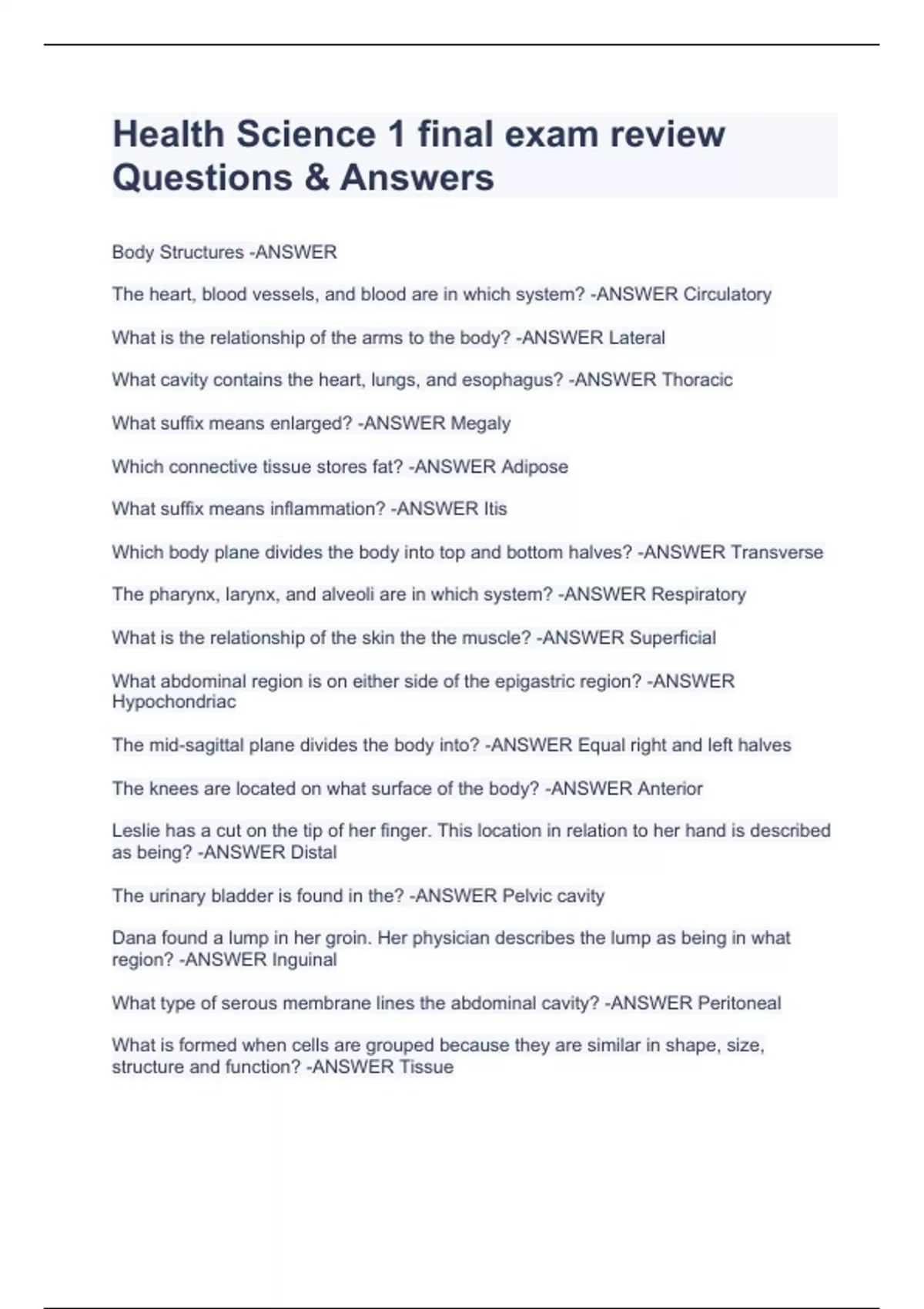 Body Structures -ANSWER The heart, blood vessels, and blood are in which system? -ANSWER Circulatory What is the relationship of the arms to the body? -ANSWER Lateral What cavity contains the heart, lungs, and esophagus? -ANSWER Thoracic What suffix means enlarged? -ANSWER Megaly Which connective tissue stores fat? -ANSWER Adipose What suffix means inflammation? -ANSWER Itis Which body plane divides the body into top and bottom halves? -ANSWER Transverse The pharynx, larynx, and alveoli are in which system? -ANSWER Respiratory What is the relationship of the skin the the muscle? -ANSWER Superficial What abdominal region is on either side of the epigastric region? -ANSWER Hypochondriac The mid-sagittal plane divides the body into? -ANSWER Equal right and left halves The knees are located on what surface of the body? -ANSWER Anterior Leslie has a cut on the tip of her finger. This location in relation to her hand is described as being? -ANSWER Distal The urinary bladder is found in the? -ANSWER Pelvic cavity Dana found a lump in her groin. Her physician describes the lump as being in what region? -ANSWER Inguinal What type of serous membrane lines the abdominal cavity? -ANSWER Peritoneal What is formed when cells are grouped because they are similar in shape, size, structure and function? -ANSWER Tissue The outer part of a serous membrane that lines a cavity is the? -ANSWER Partietal membrane The stomach, liver, and gall bladder are located in what cavity? -ANSWER Abdominal cavity Caudal means: -ANSWER Tail What region is located on either side of the umbilical region? -ANSWER Right and left lumbar The inner part of the serous membrane that lines a cavity is the? -ANSWER Visceral membrane Which prefix means below? -ANSWER Hypo What body system contains the brain, nerves, and spinal cord? -ANSWER Nervous Skeletal System -ANSWER The inner lining of the long bone is the? -ANSWER Endosteum The axial skeleton includes bones of the? -ANSWER Skull What types of joint is the elbow? -ANSWER Hinge Leah was involved in a motor vehicle accident. She has a bleeding wound on her lower leg with the ends of the bone showing. What type of fracture is this? -ANSWER Compound The shaft of the long bone is the? -ANSWER Diaphysis The end of the long bone is the? -ANSWER Epiphysis The bone forming cells are? -ANSWER Osteoblast Lou's grandmother use to be taller than all of her sisters. Now she is shorter and recently fell and fractured her hip. What disorder would cause these symptoms? -ANSWER Osteroporosis The medical term for the finger bone is? -ANSWER Phalanges The medical term for knee cap is the? -ANSWER Patella The outer covering of the bone is the? -ANSWER Periosteum Cindy has a dislocated shoulder. He