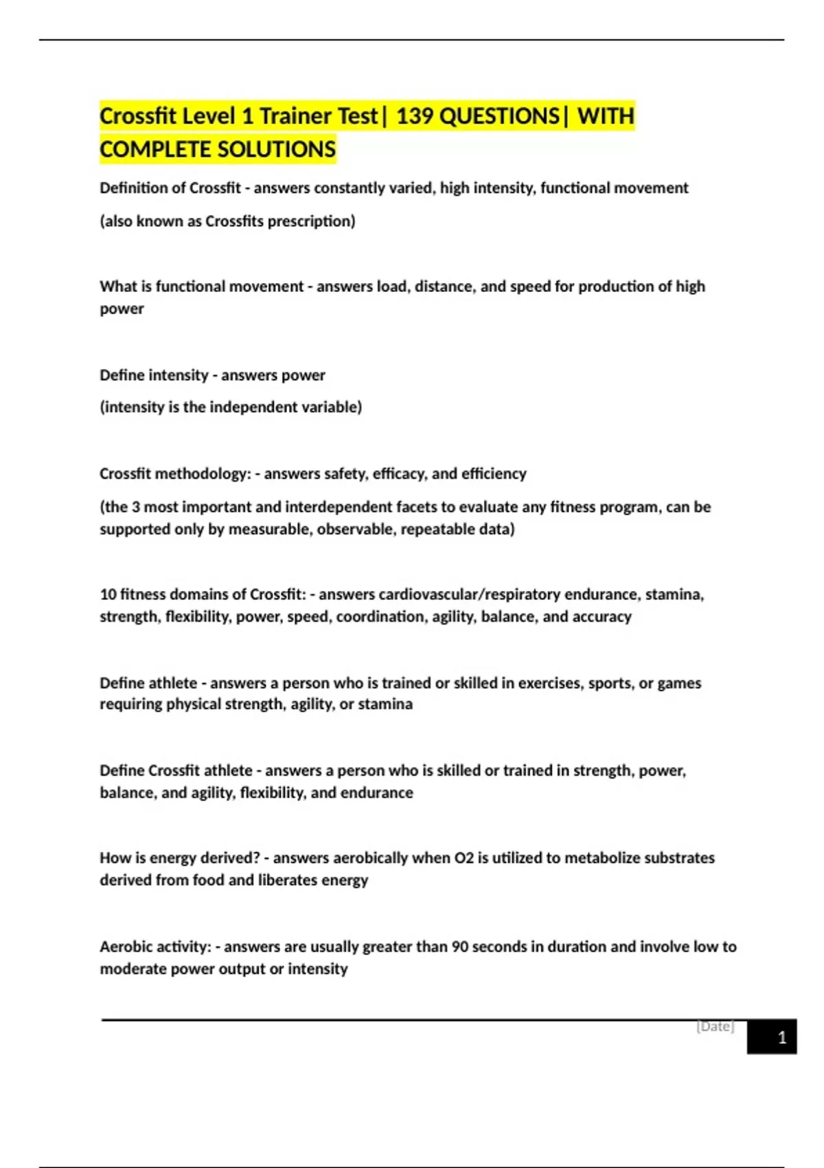 Crossfit Level 1 Trainer Test| 139 QUESTIONS| WITH COMPLETE SOLUTIONS