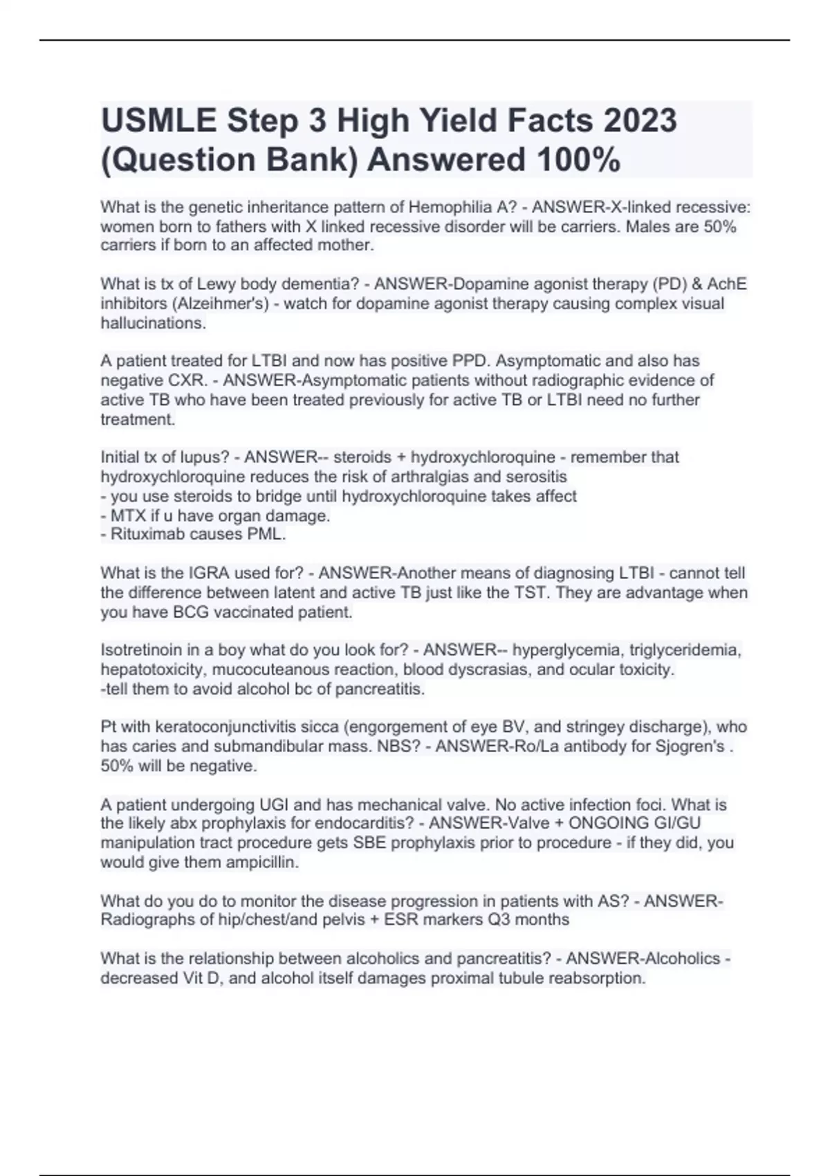 What is the genetic inheritance pattern of Hemophilia A? - ANSWER-X-linked recessive: women born to fathers with X linked recessive disorder will be carriers. Males are 50% carriers if born to an affected mother. What is tx of Lewy body dementia? - ANSWER-Dopamine agonist therapy (PD) & AchE inhibitors (Alzeihmer's) - watch for dopamine agonist therapy causing complex visual hallucinations. A patient treated for LTBI and now has positive PPD. Asymptomatic and also has negative CXR. - ANSWER-Asymptomatic patients without radiographic evidence of active TB who have been treated previously for active TB or LTBI need no further treatment. Initial tx of lupus? - ANSWER-- steroids + hydroxychloroquine - remember that hydroxychloroquine reduces the risk of arthralgias and serositis - you use steroids to bridge until hydroxychloroquine takes affect - MTX if u have organ damage. - Rituximab causes PML. What is the IGRA used for? - ANSWER