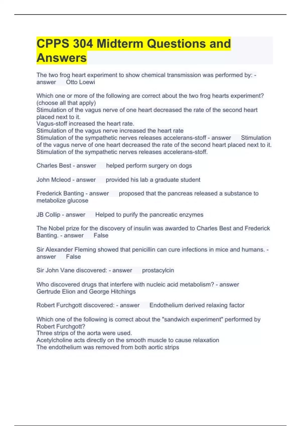 CPPS 304 Midterm Questions and Answers The two frog heart experiment to show chemical transmission was performed by: Otto Loewi Which one or more of the following are correct about the two frog hearts experiment? (choose all that apply) Stimulation of the vagus nerve of one heart decreased the rate of the second heart placed next to it. Vagus-stoff increased the heart rate. Stimulation of the vagus nerve increased the heart rate Stimulation of the sympathetic nerves releases accelerans-stoff Stimulation of the vagus nerve of one heart decreased the rate of the second heart placed next to it. Stimulation of the sympathetic nerves releases accelerans-stoff. Charles Best helped perform surgery on dogs John Mcleod provided his lab a graduate student Frederick Banting proposed that the pancreas released a substance to metabolize glucose JB Collip Helped to purify the pancreatic enzymes The Nobel prize for the discovery of insulin was awarded to Charles Best and Frederick Banting. False Sir Alexander Fleming showed that penicillin can cure infections in mice and humans. False Sir John Vane discovered: prostacylcin Who discovered drugs that interfere with nucleic acid metabolism? Gertrude Elion and George Hitchings Robert Furchgott discovered: Endothelium derived relaxing factor Which one of the following is correct about the "sandwich experiment" performed by Robert Furchgott? Three strips of the aorta were used. Acetylcholine acts directly on the smooth muscle to cause relaxation The endothelium was removed from both aortic strips Acetylcholine acts on the endothelium to release a relaxing factor. Acetylcholine acts on the endothelium to release a relaxing factor. Sir James Black developed the concept of "receptor selective drugs". True Origin of pharmacology word, early substances/compounds used as medicine ... Define pharmacopeia and contribution of Pedanius Dioscorides ...