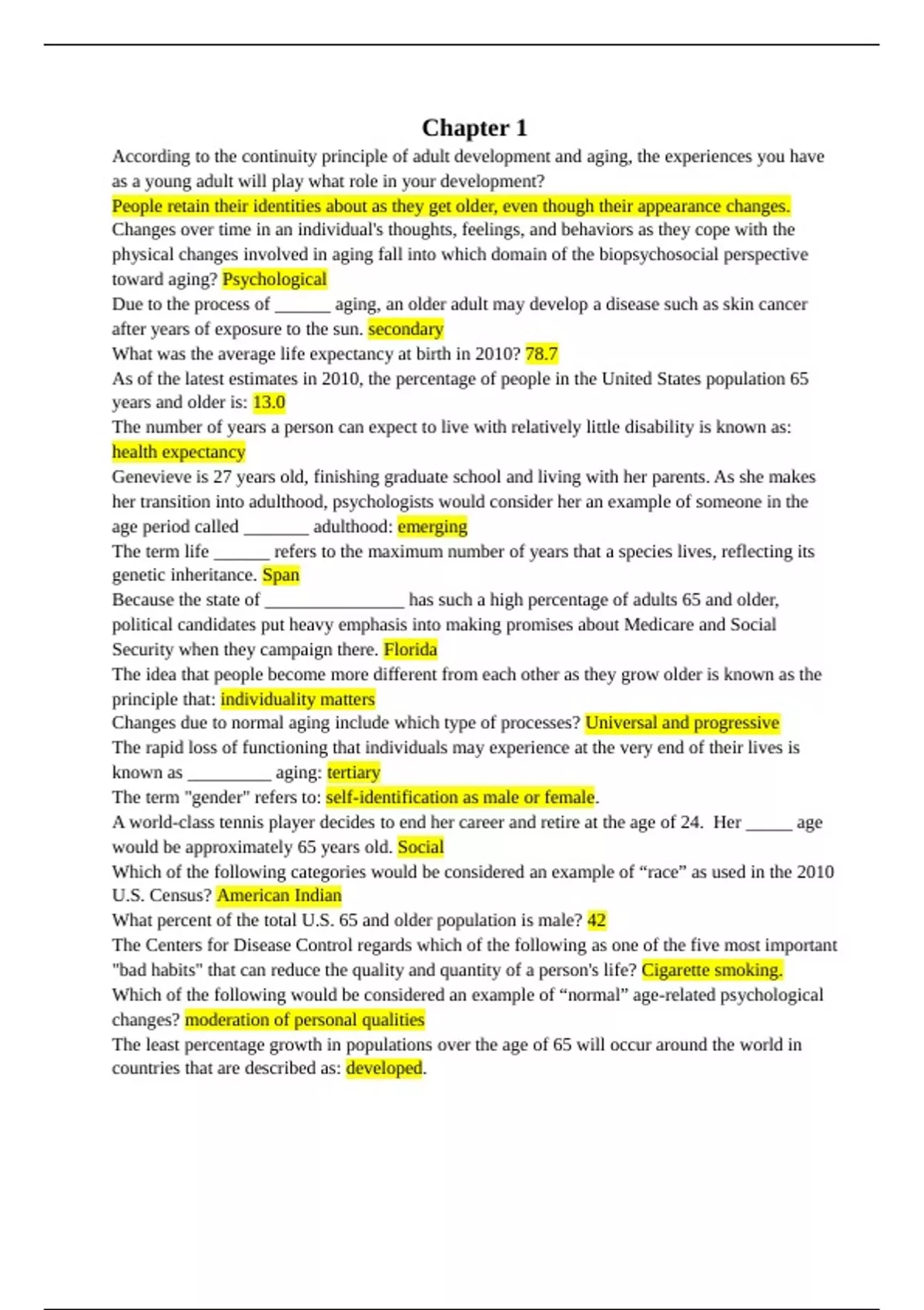 Chapter 1 According to the continuity principle of adult development and aging, the experiences you have as a young adult will play what role in your development? People retain their identities about as they get older, even though their appearance changes. Changes over time in an individual's thoughts, feelings, and behaviors as they cope with the physical changes involved in aging fall into which domain of the biopsychosocial perspective toward aging? Psychological Due to the process of ______ aging, an older adult may develop a disease such as skin cancer after years of exposure to the sun. secondary What was the average life expectancy at birth in 2010? 78.7 As of the latest estimates in 2010, the percentage of people in the United States population 65 years and older is: 13.0 The number of years a person can expect to live with relatively little disability is known as: health expectancy Genevieve is 27 years old, finishing graduate school and living with her parents. As she makes her transition into adulthood, psychologists would consider her an example of someone in the age period called _______ adulthood: emerging The term life ______ refers to the maximum number of years that a species lives, reflecting its genetic inheritance. Span Because the state of _______________ has such a high percentage of adults 65 and older, political candidates put heavy emphasis into making promises about Medicare and Social Security when they campaign there. Florida The idea that people become more different from each other as they grow older is known as the principle that: individuality matters Changes due to normal aging include which type of processes? Universal and progressive The rapid loss of functioning that individuals may experience at the very end of their lives is known as _________ aging: tertiary The term "gender" refers to: self-identification as male or female. A world-class tennis player decides to end her career and retire at the age of 24. Her _____ age would be approximately 65 years old. Social Which of the following categories would be considered an example of “race” as used in the 2010 U.S. Census? American Indian What percent of the total U.S. 65 and older population is male? 42 The Centers for Disease Control regards which of the following as one of the five most important "bad habits" that can reduce the quality and quantity of a person's life? Cigarette smoking. Which of the following would be considered an example of “normal” age-related psychological changes? moderation of personal qualities The least percentage growth in populations over the age of 65 will occur around the world in countries that are described as: developed. The main focus of the large British study known as Whitehall II is on the role of ____________ as a factor in development. social class Which of the following topics would be considered to provide evidence on the effect of sex in development? Role of hormones in behavior. Which of the following is considered an example of secondary aging? Marrying for the third time at age 55. The index of age that represents a person's functioning on measures such as intelligence, memory, and learning ability is called ___________ age. Psychological Individuals who are in the period of emerging adulthood are likely to show which qualities? Transition to responsible family and work roles. People referred to as “old-old” have which specific characteristic? Between the ages of 75-84 People now considered supercentenarians, such as Jeanne Louise Calment, live past the age of: 110 Which of the following might account for the fact that the people who live to old age are the “survivors”? Their families provided a strong support network. The increased population of adults 65 and older in the U.S. can be attributed specifically to the higher life _______ being achieved by current generations. Expectancy Of the following areas of aging, which would be considered a “biological” component of the biopsychosocial model? Changes in muscle mass The number of people 65 and older projected to be alive around the world in 2050 is approximately 1.5 billion The changes that individuals experience in income and residence when they retire and move out of the home where they spent their working lives would fall into the ____________ domain of the biopsychosocial model. Sociocultural The term __________ captures the concept that aging involves an interaction among processes such as physical changes, cognition, and social context: biopsychosocial A 77-year-old man has loved to jog for his entire life, and he is still able to keep up a pretty good pace. However, he is suffering hearing loss which makes it difficult for him to enjoy the music he likes to play while out on his run. In addition, he's noticing that it's getting harder for him to see the street signs unless the sun is brightly shining. This man illustrates which principle of aging? Multidirectionality Which racial/ethnic minority group in the U.S. is expected to show the largest decrease in the U.S. population between 2010 and 2050? Non-hispanic White Census 2010 estimates that the number of people 65 plus and older in the U.S. is _____ million. 40.3 The ________________ principle of adult development and aging proposes that changes build on themselves over life in a cumulative fashion. Continuity The parents of people in the Baby Boom generation are known as: Silent Generation A term in gerontology used to refer to people who are in the age group of 65-74 is: young-old The idea there are differences within the individual in the rate of aging is referred to as: multidirectionality. The large impact that Hurricane Sandy had on residents of the Northeast U.S. in 2012 makes it a ________________ influence on development. normative history-graded Which of the following would be considered a “social” age-related factor in the biopsychosocial perspective? Becoming a grandparent. 75-year-old Mrs. A. has difficulty 