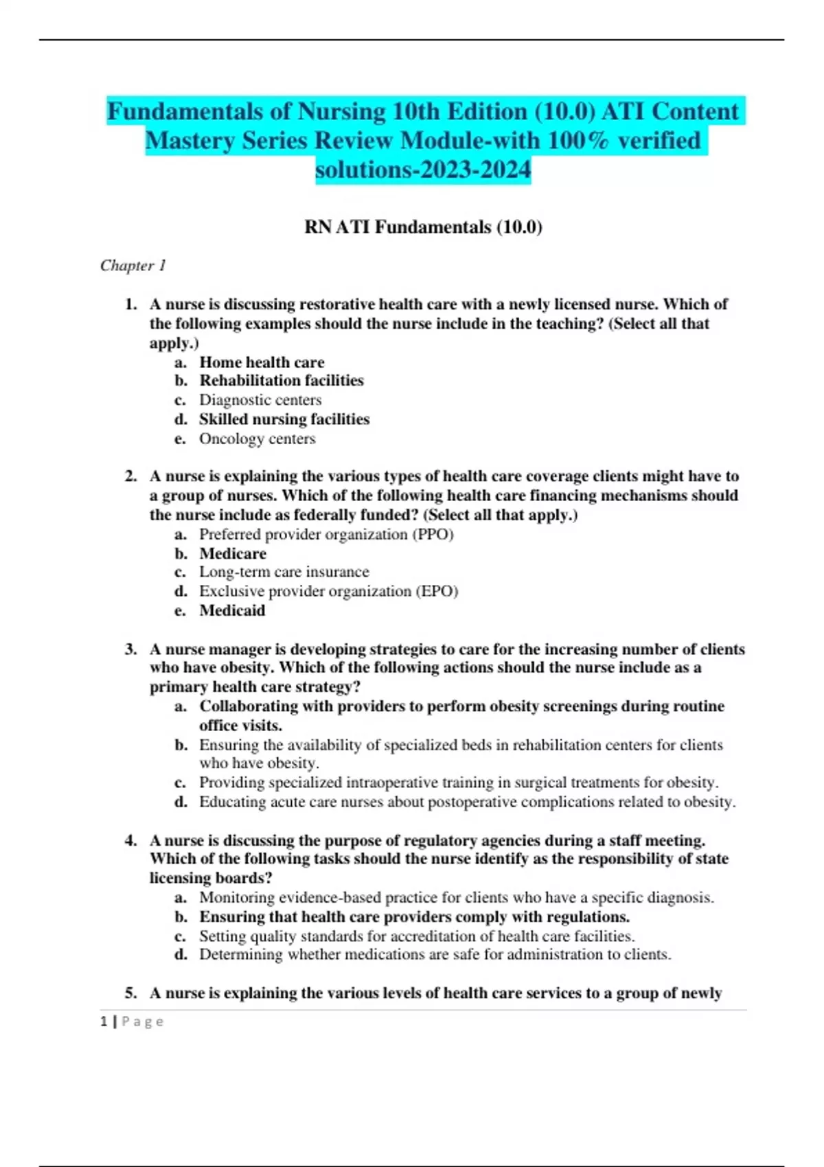 Fundamentals of Nursing 10th Edition (10.0) ATI Content Mastery Series Review Module-with 100% verified solutions-