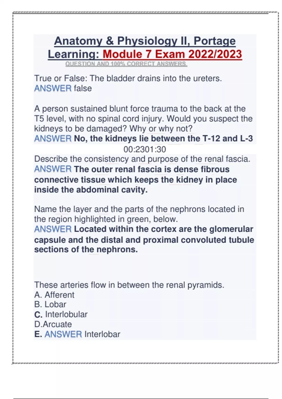True or False: The bladder drains into the ureters. ANSWER false A person sustained blunt force trauma to the back at the T5 level, with no spinal cord injury. Would you suspect the kidneys to be damaged? Why or why not? ANSWER No, the kidneys lie between the T-12 and L-3 00:2301:30 Describe the consistency and purpose of the renal fascia. ANSWER The outer renal fascia is dense fibrous connective tissue which keeps the kidney in place inside the abdominal cavity. Name the layer and the parts of the nephrons located in the region highlighted in green, below. ANSWER Located within the cortex are the glomerular capsule and the distal and proximal convoluted tubule sections of the nephrons. These arteries flow in between the renal pyramids. A. Afferent B. Lobar C. Interlobular D.Arcuate E. ANSWER Interlobar F. Renal After filtration occurs, next blood travels into these vessels. A. ANSWER Efferent arteriole B. Lobar veins C. Interlobular veins D. Arcuate artery E. Interlobar vein F. Vasa recta Name the region in the diagram below, indicated by the red arrow. ANSWER DCT (Distal convoluted tubule) Which of the following is false about the location of the bladder? A. In males, the bladder is anterior to the rectum. B. In females, the bladder is posterior to the uterus. C. In females, the bladder is in between the rectum and the uterus. D. In males, the bladder is above the prostate gland. ANSWER E. B&C are false F. A&D are false Describe the purposes of the urethral sphincters. ANSWER ● The involuntary-controlled internal urethral sphincter is located near the bladder and keeps the urethra closed to prevent urine from leaving the bladder. ● The voluntary-controlled external urethral sphincter, composed of skeletal muscle, surrounds the urethra as it passes through the pelvic floor. A patient was just placed under general anesthesia. He is now awake and telling you he is having a hard time excreting urine. What is most likely causing the difficulty? A. Incontinence due to stroke B. Incontinence due to dementia C. Urinary retention due to spinal cord injury D. Bladder outlet obstruction E. ANSWER Urinary retention due to slowed detrusor muscle This region of the male urethra exits the body. A. ANSWER Spongy B. Prostatic C. Membranous D. Ejaculatory duct E. Ureters What causes the extremely high blood pressure in the glomerular capillaries?