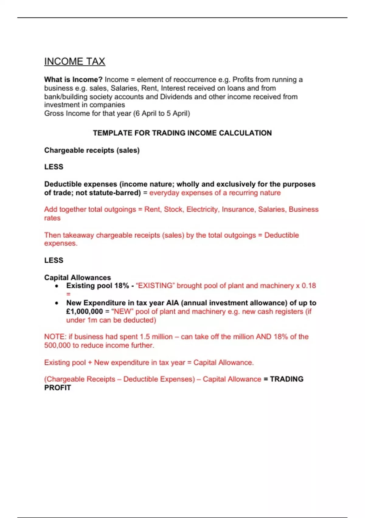 (Chargeable Receipts – Deductible Expenses) – Capital Allowance = TRADING