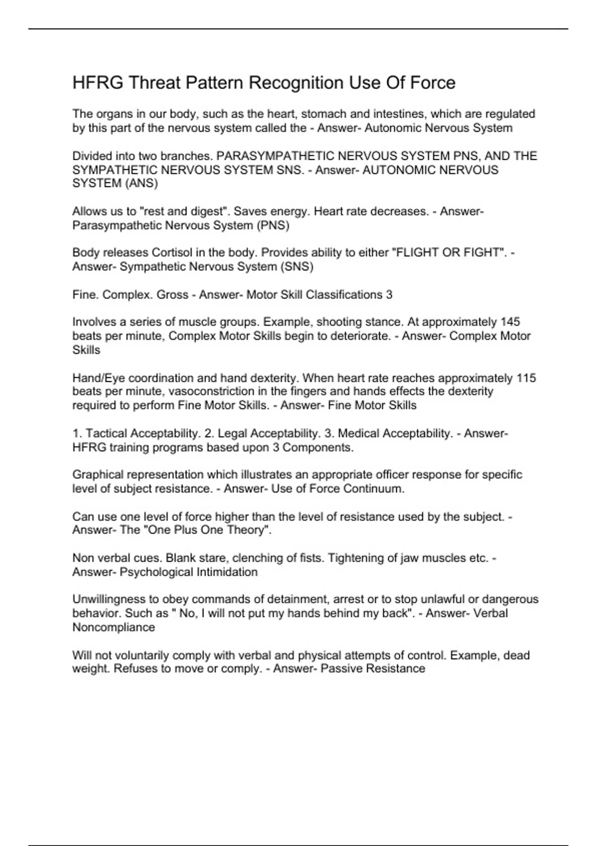 The organs in our body, such as the heart, stomach and intestines, which are regulated by this part of the nervous system called the - Answer- Autonomic Nervous System Divided into two branches. PARASYMPATHETIC NERVOUS SYSTEM PNS, AND THE SYMPATHETIC NERVOUS SYSTEM SNS. - Answer- AUTONOMIC NERVOUS SYSTEM (ANS) Allows us to "rest and digest". Saves energy. Heart rate decreases. - Answer- Parasympathetic Nervous System (PNS) Body releases Cortisol in the body. Provides ability to either "FLIGHT OR FIGHT". - Answer- Sympathetic Nervous System (SNS) Fine. Complex. Gross - Answer- Motor Skill Classifications 3 Involves a series of muscle groups. Example, shooting stance. At approximately 145 beats per minute, Complex Motor Skills begin to deteriorate. - Answer- Complex Motor Skills Hand/Eye coordination and hand dexterity. When heart rate reaches approximately 115 beats per minute, vasoconstriction in the fingers and hands effects the dexterity required to perform Fine Motor Skills. - Answer- Fine Motor Skills 1. Tactical Acceptability. 2. Legal Acceptability. 3. Medical Acceptability. - Answer- HFRG training programs based upon 3 Components. Graphical representation which illustrates an appropriate officer response for specific level of subject resistance. - Answer- Use of Force Continuum. Can use one level of force higher than the level of resistance used by the subject. - Answer- The "One Plus One Theory". Non verbal cues. Blank stare, clenching of fists. Tightening of jaw muscles etc. - Answer- Psychological Intimidation Unwillingness to obey commands of detainment, arrest or to stop unlawful or dangerous behavior. Such as " No, I will not put my hands behind my back". - Answer- Verbal Noncompliance Will not voluntarily comply with verbal and physical attempts of control. Example, dead weight. Refuses to move or comply. - Answer- Passive Resistance