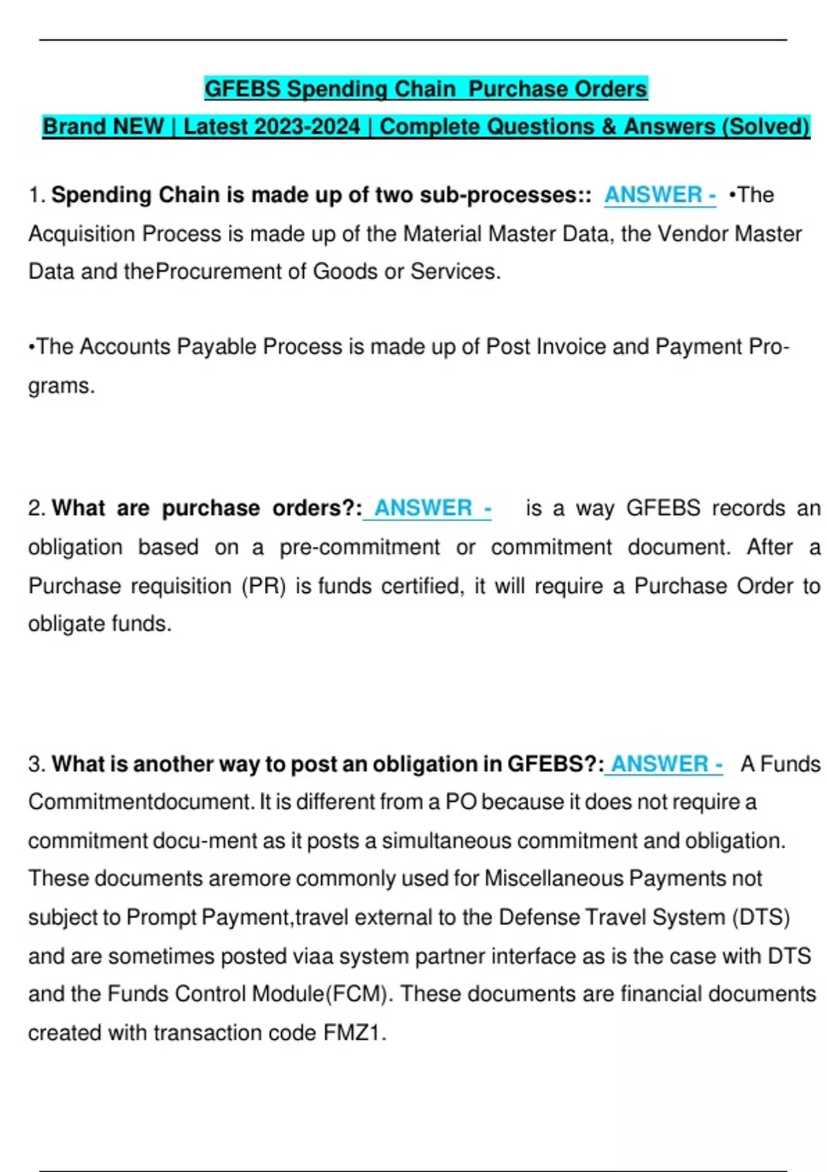 GFEBS Spending Chain Purchase Orders Brand NEW | Latest | Complete Questions & Answers (Solved)