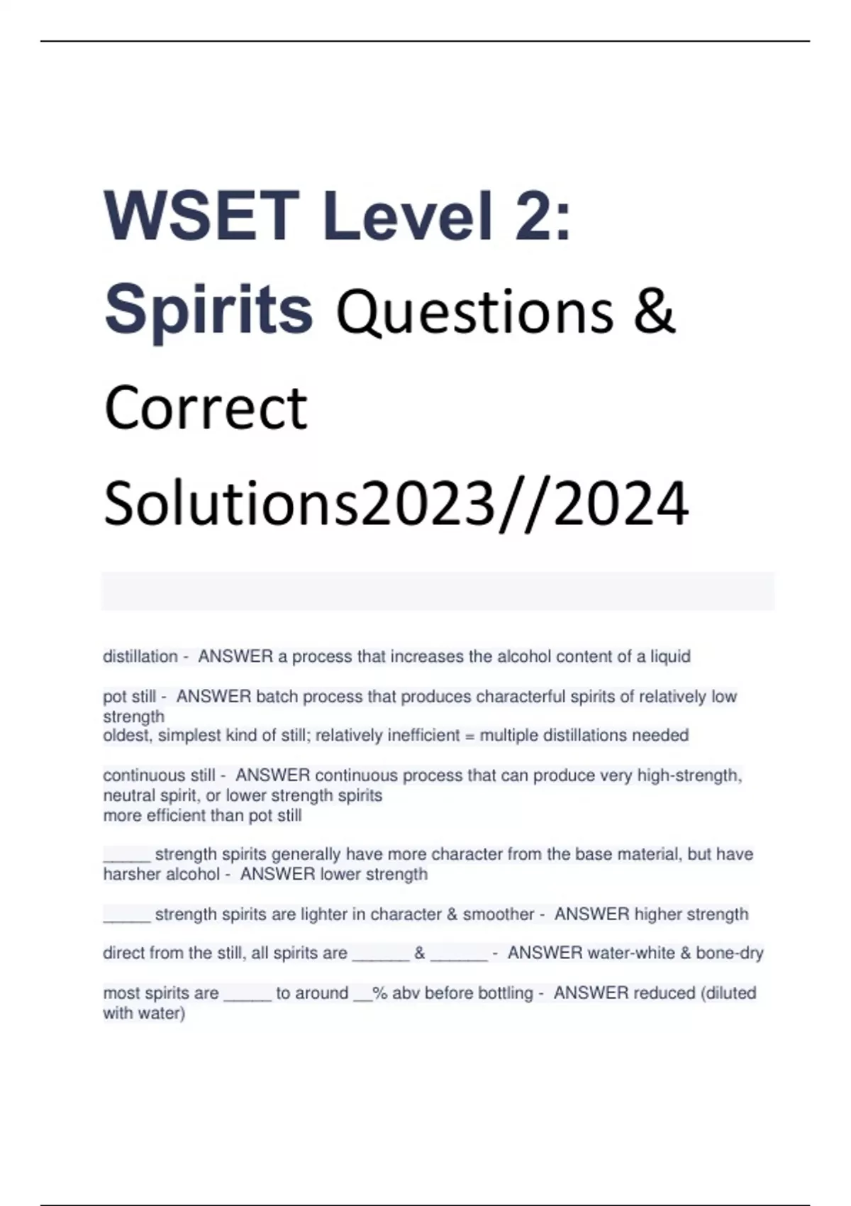 WSET Level 2: Spirits Questions & Correct Solutions2023//2024 distillation - ANSWER a process that increases the alcohol content of a liquid pot still - ANSWER batch process that produces characterful spirits of relatively low strength oldest, simplest kind of still; relatively inefficient = multiple distillations needed continuous still - ANSWER continuous process that can produce very high-strength, neutral spirit, or lower strength spirits more efficient than pot still _____ strength spirits generally have more character from the base material, but have harsher alcohol - ANSWER lower strength _____ strength spirits are lighter in character & smoother - ANSWER higher strength direct from the still, all spirits are ______ & ______ - ANSWER water-white & bone-dry most spirits are _____ to around __% abv before bottling - ANSWER reduced (diluted with water) 40% abv _____ are extremely important in most spirits categories - ANSWER Brands ethanol boils at a _____ temperature than water - ANSWER lower heads - ANSWER aka foreshots the most volatile components, which boil off first in a still contain undesirable components including methanol not used in the final spirit, returned to pot to be redistilled hearts - ANSWER aka spirit follows the heads contains the highest proportion of ethanol & lowest proportion of undesirable impurities tails - ANSWER aka feints least volatile components that boil off last & not used in the final spirit, returned to the pot to be redistilled most stills are made of ____ - ANSWER copper when tasting spirits, more emphasis is placed on ____ - ANSWER the aromas & flavors- especially in the finish when tasting spirits, pour __mL of the spirt to assess ____ & then add ___mL of ___ to assess the ____ & _____ - ANSWER -25mL spirits to assess appearance -25mL water to assess the nose & palate _____ in spirits is usually a sign of a fault - ANSWER haziness adding water to spirits helps to _____ - ANSWER release the aromas (do not swirl