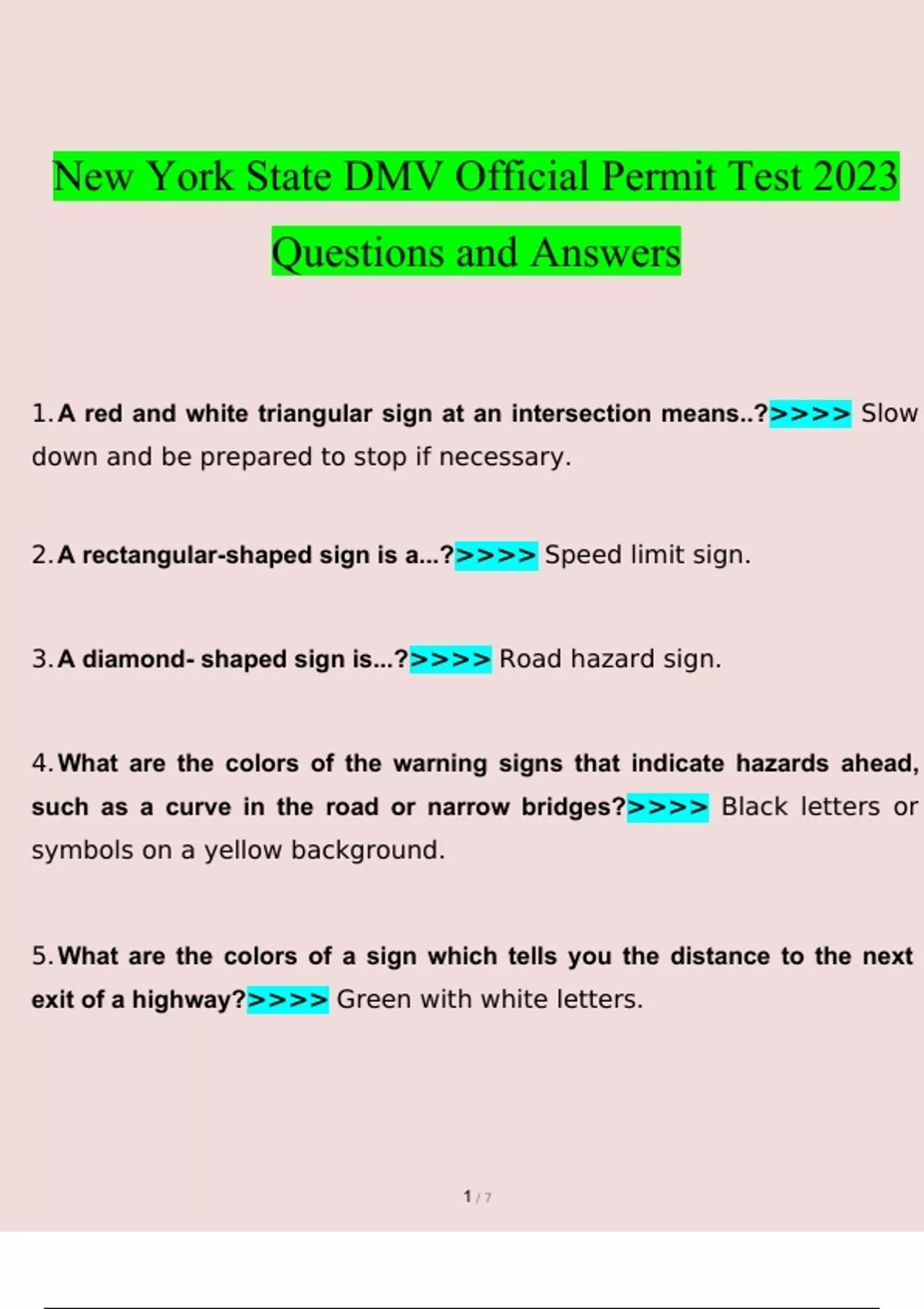 Official Permit Test DMV New York State Questions With Verified Answers