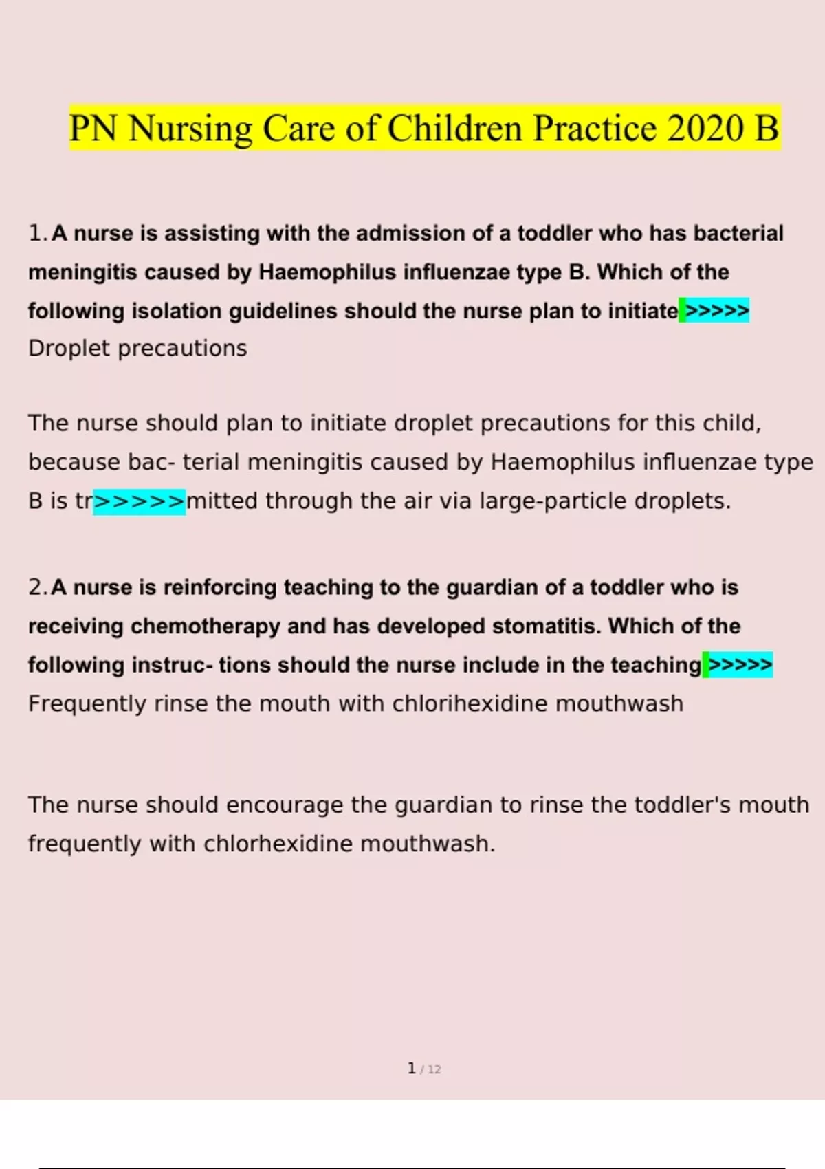 PN Nursing Care of Children Practice 2020 b Questions With Verified Answers