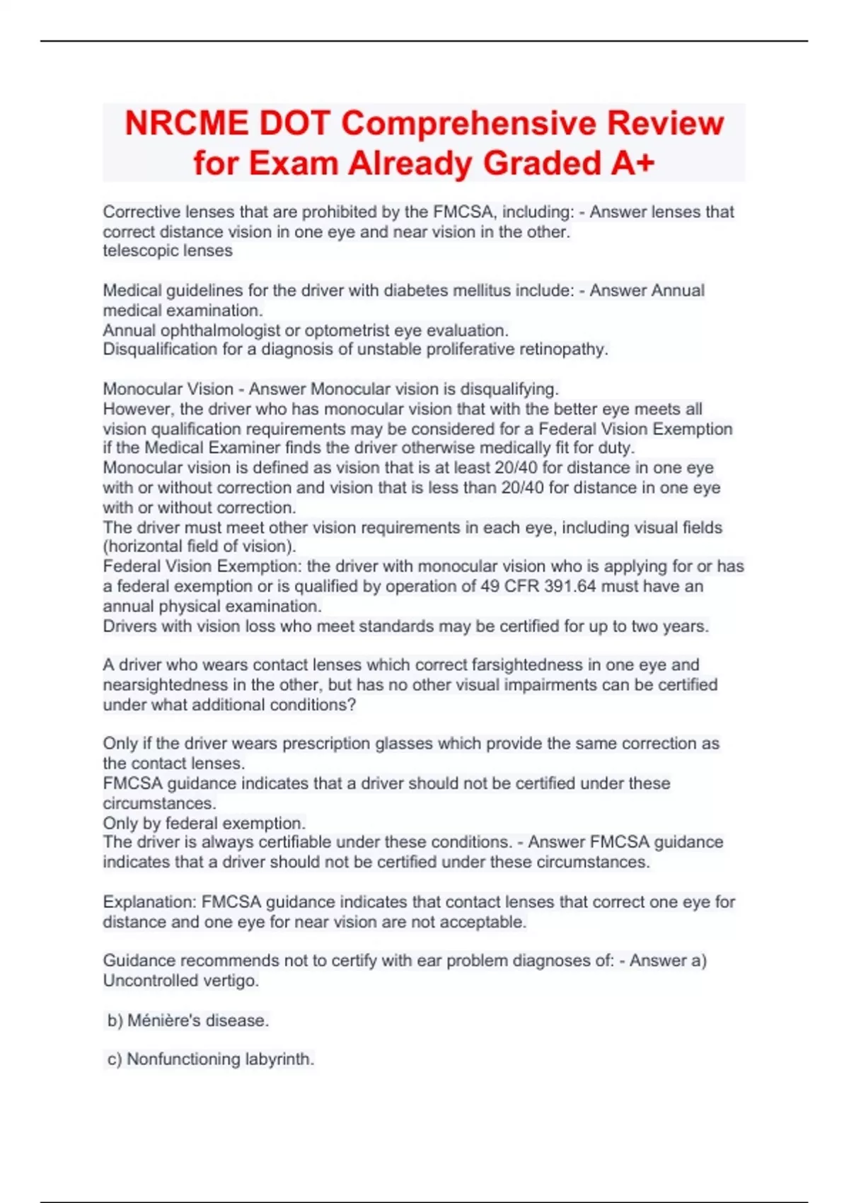 NRCME DOT Comprehensive Review for Exam Already Graded A+ Corrective lenses that are prohibited by the FMCSA, including: - Answer lenses that correct distance vision in one eye and near vision in the other. telescopic lenses Medical guidelines for the driver with diabetes mellitus include: - Answer Annual medical examination. Annual ophthalmologist or optometrist eye evaluation. Disqualification for a diagnosis of unstable proliferative retinopathy. Monocular Vision - Answer Monocular vision is disqualifying. However, the driver who has monocular vision that with the better eye meets all vision qualification requirements may be considered for a Federal Vision Exemption if the Medical Examiner finds the driver otherwise medically fit for duty. Monocular vision is defined as vision that is at least 20/40 for distance in one eye with or without correction and vision that is less than 20/40 for distance in one eye with or without correction. The driver must meet other vision requirements in each eye, including visual fields (horizontal field of vision). Federal Vision Exemption: the driver with monocular vision who is applying for or has a federal exemption or is qualified by operation of 49 CFR 391.64 must have an annual physical examination. Drivers with vision loss who meet standards may be certified for up to two years. A driver who wears contact lenses which correct farsightedness in one eye and nearsightedness in the other, but has no other visual impairments can be certified under what additional conditions? Only if the driver wears prescription glasses which provide the same correction as the contact lenses. FMCSA guidance indicates that a driver should not be certified under these circumstances. Only by federal exemption. The driver is always certifiable under these conditions. - Answer FMCSA guidance indicates that a driver should not be certified under these circumstances. Explanation: FMCSA guidance indicates that contact lenses that correct one eye for distance and one eye for near vision are not acceptable. Guidance recommends not to certify with ear problem diagnoses of: - Answer a) Uncontrolled vertigo. b) Ménière's disease. c) Nonfunctioning labyrinth. d) Nonfunctioning fistula. The medical examiner's role in the exemption process includes _________. Issuing the exemption. Issuing the prescription for the driver's contact lenses and/or glasses. Providing the driver with contact information for the Federal Vision Exemption Program. Assuring that the driver has peripheral vision of at least 110 degrees in each eye. - Answer Providing the driver with contact information for the Federal Vision Exemption Program. Explanation: The medical examiner's role in the exemption process is limited to performing the driver examination and providing the driver with contact information for the FMCSA related to the exemption process. An audiometric test produces the following results: Left ear: 500 Hz, 35dB Loss; 1,000 Hz, 35 dB loss; 2,000 Hz 45 dB loss. Right ear: 500 Hz, 40 dB loss; 1,000 Hz, 45 dB loss; 2,000 40 dB loss. What is the certification? Certify for one year. Certify for two years. Do not certify. Certify only when accompanied by hearing aid. - Answer Certify for two years. Explanation: Drivers with an average hearing loss of < 40 decibels averaged across 500, 1000, and 2000 Hz in the better ear may be certified for two years. What eye conditions must the medical examiner ask the driver about? Cataracts, color deficiencies, retinitis pigmentosa, aphakia, glaucoma. Lazy eye, cataracts, aphakia, floaters, retinopathy. Glaucoma, macular degeneration, retinitis pigmentosa, color deficiencies. Retinopathy, cataracts, aphakia, glaucoma, macular degeneration. - Answer Retinopathy, cataracts, aphakia, glaucoma, macular degeneration. Explanation: These are the "ask about" vision conditions. The medical examiner may ask the driver about any eye conditions, but should ask the driver about these specified conditions. Which of the following drivers' tests meet hearing certification standards? Whisper test 4 feet right ear, 3 feet left ear. Whisper test 5 feet right ear with hearing aid, 3 feet left ear without hearing aid. Audiogram left 30/500 Hz, 40/1000 Hz, 60/2000 Hz; right 25/500 Hz, 35/1000 Hz, 80/2000 Hz. Audiogram left 35/500 Hz, 50/1000 Hz, 40/3000 Hz; right 35/500 Hz, 35/1000 Hz, 60/3000 Hz. - Answer Whisper test 5 feet right ear with hearing aid, 3 feet left ear without hearing aid. Explanation: Whisper test results require 5 feet in at least one ear for passing, with or without a hearing aid. Audiometric testing results require an average of 40 dB loss in the better ear for results averaged across 500, 1000, and 2000 Hz. Although testing may be performed at 3000 Hz, results obtained are not used to determine whether the driver meets hearing requirements. A driver has loss of hearing in the better ear of 25 dB loss at 500 Hz, 40 dB loss at 1000 Hz, and 60 dB loss at 2000 Hz. With respect to the hearing requirement for medical certification, the driver __________. May be certified for one year. May be certified for two years. May not be certified. May be certified if examined by an otolaryngologist who is familiar with the CMV driving duties who certifies the driver as medically qualified to drive a CMV. - Answer May not be certified. Explanation: An average hearing loss of 41.7 decibels averaged across 500, 1000, and 2000 Hz in the better ear is disqualifying. The driver should be referred to obtain a hearing aid and may be certified if the driver passes while wearing a hearing aid. A specialist cannot determine certification, and a specialist cannot override medical qualification standards such as the minimum hearing requirement. Which of the following is acceptable for a driver who wears a hearing aid? Testing of the driver's hearing is waived if the driver presents a letter from a qualified specialist. Testing of the driver's hearing may be performed by the medical examiner u