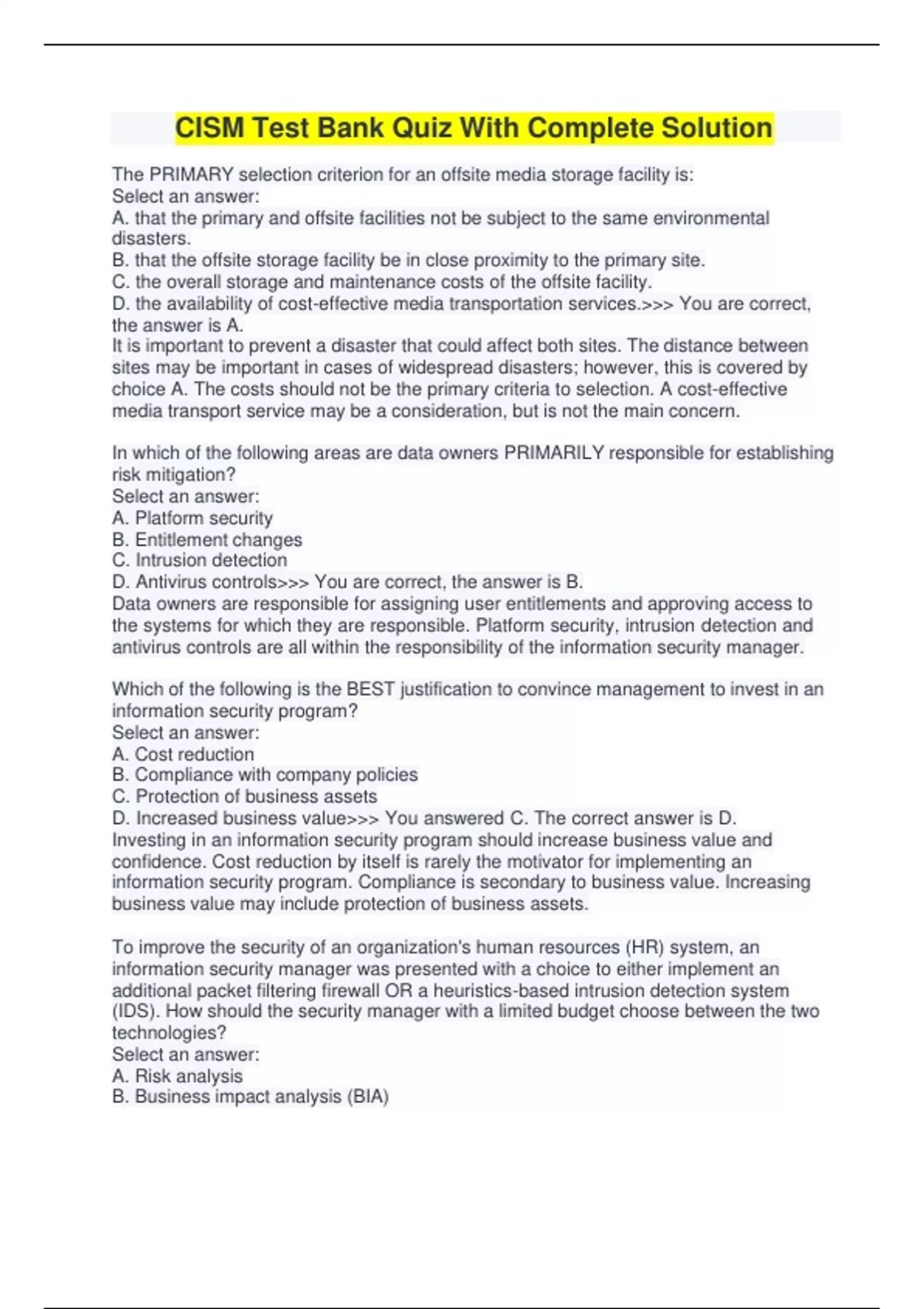 CISM Test Bank Quiz With Complete Solution