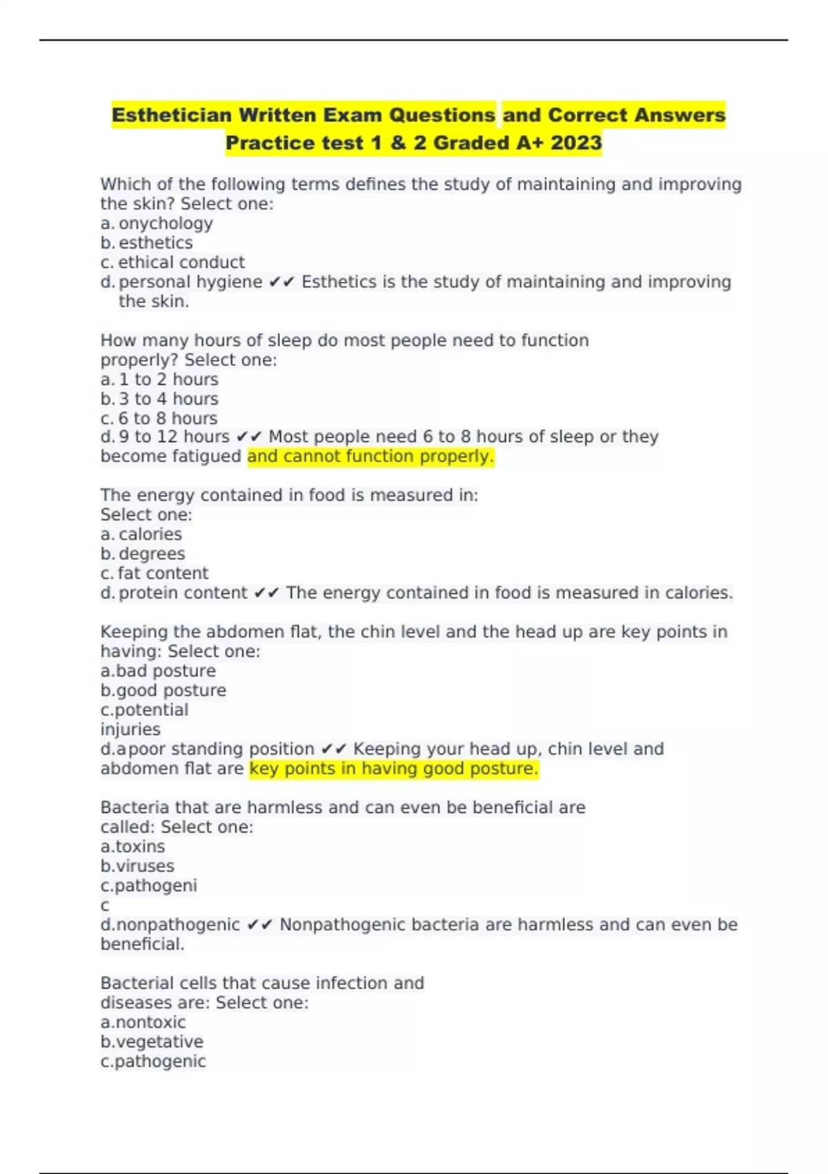 Esthetician Written Exam Questions and Correct Answers Practice test 1 & 2 Graded A+ 2023 Which of the following terms defines the study of maintaining and improving the skin? Select one: a. onychology b. esthetics c. ethical conduct d. personal hygiene Esthetics is the study of maintaining and improving the skin. How many hours of sleep do most people need to function properly? Select one: a. 1 to 2 hours b. 3 to 4 hours c. 6 to 8 hours d. 9 to 12 hours Most people need 6 to 8 hours of sleep or they become fatigued and cannot function properly. The energy contained in food is measured in: Select one: a. calories b. degrees c. fat content d. protein content The energy contained in food is measured in calories. Keeping the abdomen flat, the chin level and the head up are key points in having: Select one: posture posture tial injuries d.a poor standing position Keeping your head up, chin level and abdomen flat are key points in having good posture. Bacteria that are harmless and can even be beneficial are called: Select one: s es genic thogenic Nonpathogenic bacteria are harmless and can even be beneficial. Bacterial cells that cause infection and diseases are: Select one: xic ative genic thogenic Pathogenic bacterial cells can cause infections and diseases. Infectious bacteria can be easily spread in the workplace in all of the following ways EXCEPT: Select one: hands fingernails minated implements ed nose while sneezing Infectious materials can be easily spread in the workplace by using contaminated implements or via dirty hands and fingernails. A communicable disease refers to a disease that is: Select one: ve thogenic d from one person to another spread from one person to another A disease that is easily spread from one person to another is referred to as communicable. A special group or type of antibodies which render a toxic substance harmless are known as: Select one: s es ria d.a ntitoxins A special group or type of antibodies which render a toxic substance harmless are known as antitoxins. Bacteria can enter the body through all of the following ways EXCEPT: Select one: hy skin d.b reak in the skin Bacteria can enter the body through the nose, mouth and a break in the skin. A difference between viruses and bacterial infections is: Select one: es can be treated with antibiotics es cannot be treated with antibiotics rial infections cause the common cold d.b acterial infections have larger sub-particles The difference between viruses and bacterial infections is that viruses are not treatable with antibiotics, while bacterial infections can generally be treated with appropriate antibiotics. What is a highly infectious disease that infects the liver? Select one: w fever c.Human Hepatitis B Virus (HBV) d.Acquired Immunodeficiency Syndrome (AIDS) Human Hepatitis B Virus (HBV) is a highly infectious disease that infects the liver. An infection that is located in a small, confined area is known as a: Select one: infection al infection gious infection omatic infection An infection that is located in a small, confined area is known as a local infection. Efforts to prevent the spread of communicable diseases is described as: Select one: ity ing tion control d.Safety Data Sheets (SDS) Efforts to prevent the spread of communicable diseases is described as infection control. Virucidals are disinfectants used to kill: Select one: es omonas ul bacteria Virucidals are disinfectants used to kill viruses. The regulatory agency under the U.S. Department of Labor that enforces safety and health standards in the workplace is: Select one: a.EPA b.SDS c.NIOSH d.OSHA OSHA is the agency under the U.S. Department of Labor that enforces safety and health standards in the workplace. Key product information-such as toxicology, first-aid, firefighting measures and ecological information-is provided by the: Select one: a.SDS b.DNR c.EPA d.USDA The SDS provides key information on products regarding toxicology, first- aid, firefighting measures and ecological information. Examples of personal protective equipment (PPE) include all of the following EXCEPT: Select one: s masks y glasses Examples of personal protective equipment (PPE) include gloves, apron, face masks and safety glasses. What is the foundation of infection control efforts and the number one thing you can do to protect yourself and your clients? Select one: antiseptics handwashing lizing multi-use supplies d.c leaning and disinfecting your tools The foundation of infection control efforts and the number one thing you can do to protect yourself and your clients is basic handwashing. Which type of light can kill bacteria that cause skin infections? Select one: red light violet light escent light descent light Bacteria that cause skin infections can be killed by ultraviolet light Which of the following terms means the product is less likely to provoke an allergic reaction? Select one: ance genic acterial llergenic Hypoallergenic means the product is less likely to provoke an allergic reaction. Ingredients responsible for producing the desired effect are called: Select one: rvative llergenic ional ingredients rmance ingredients Ingredients responsible for producing the desired effect are called performance ingredients. Which of the following are ingredients that are likely to block or clog the pores and contribute to papules and pustules? Select one: acterial ogenic llergenic -comedogenic Comedogenic ingredients are likely to block or clog the pores and contribute to papules and pustules. Which government agency is responsible for regulating cosmetics in the U.S.? Select one: a.EPA b.FDA c.OTC d.OSHA The FDA is the government agency responsible for regulating cosmetics in the U.S. Jane noticed in her appointment book that all available appointments were completely scheduled for Thursday. In the industry this is called a(n): Select one: l book ok t market If all of your appointment times have been scheduled with clients for a given day or week, you have a f